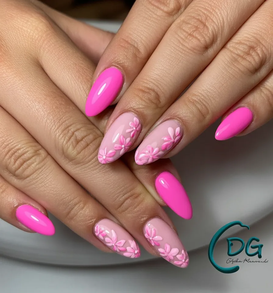 7. Bright Pink Floral Almond Nails
