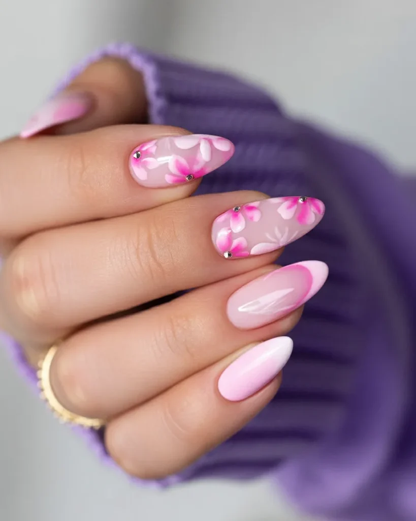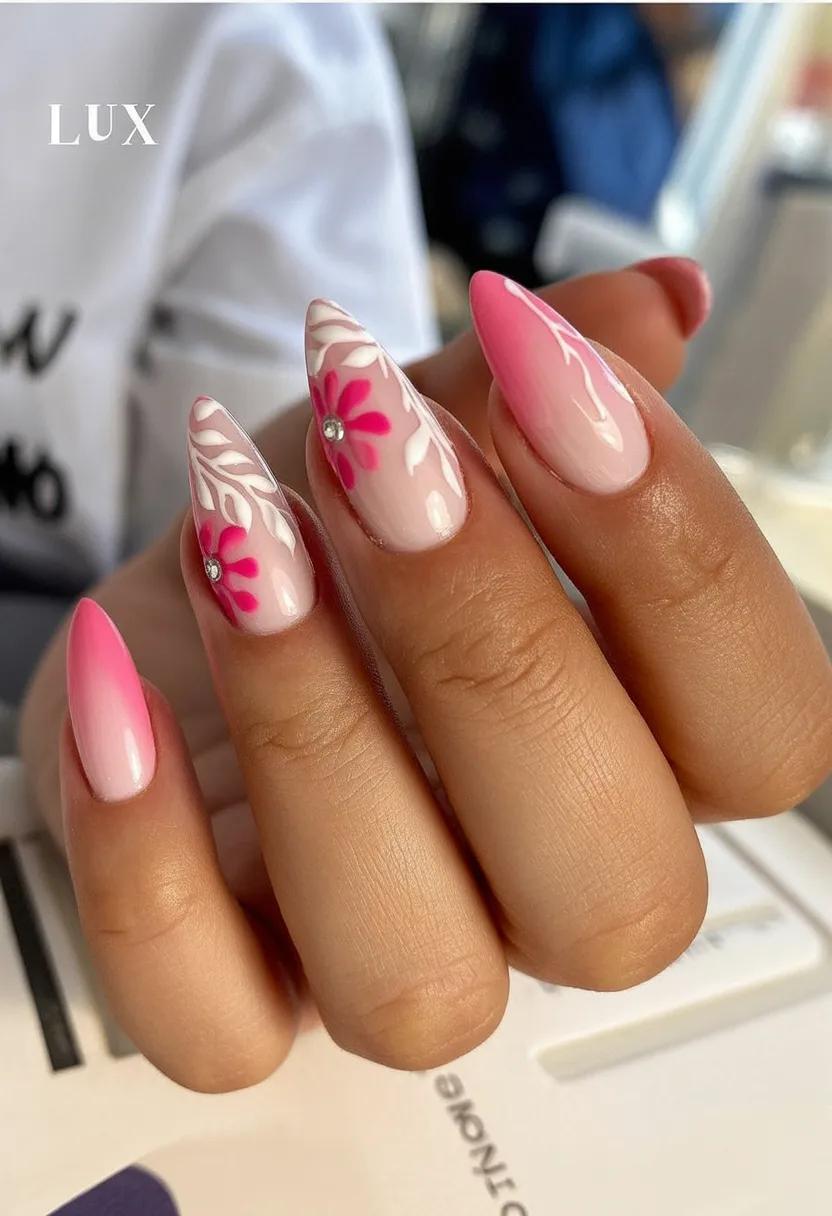 This look is all about movement and contrast. The gradient from pale pink to Hot pink feels dynamic and modern, while the almond shape keeps it elegant. It’s eye-catching without being loud—a confident, stylish way to welcome spring.