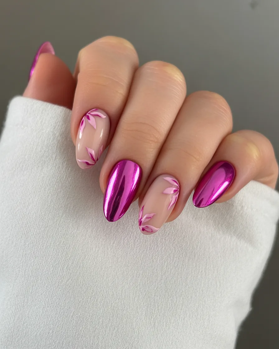 15. Pink Chrome Almond Nails with Soft Floral Details