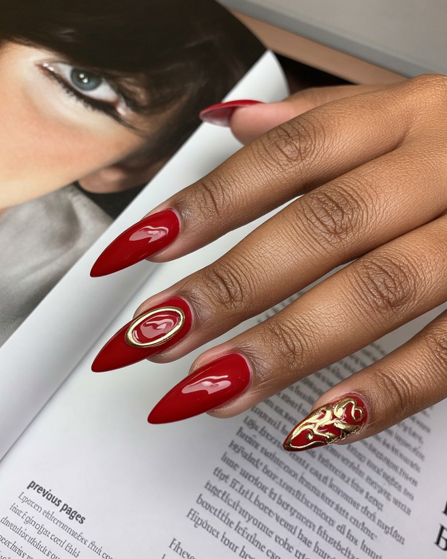 10. Bold Red Almond Nails with Gold Accents