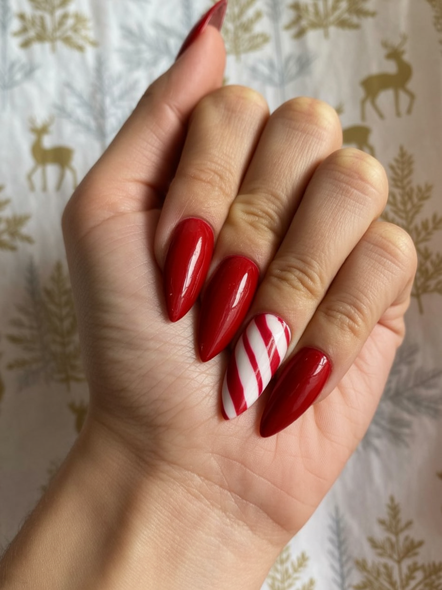 Sometimes less really is more, and these almond nails prove it. The glossy red creates a sleek and polished look, while the single striped accent nail adds just enough holiday flair to make them festive. It’s a simple design that whispers Christmas charm without shouting it, making it a classy choice for the season.