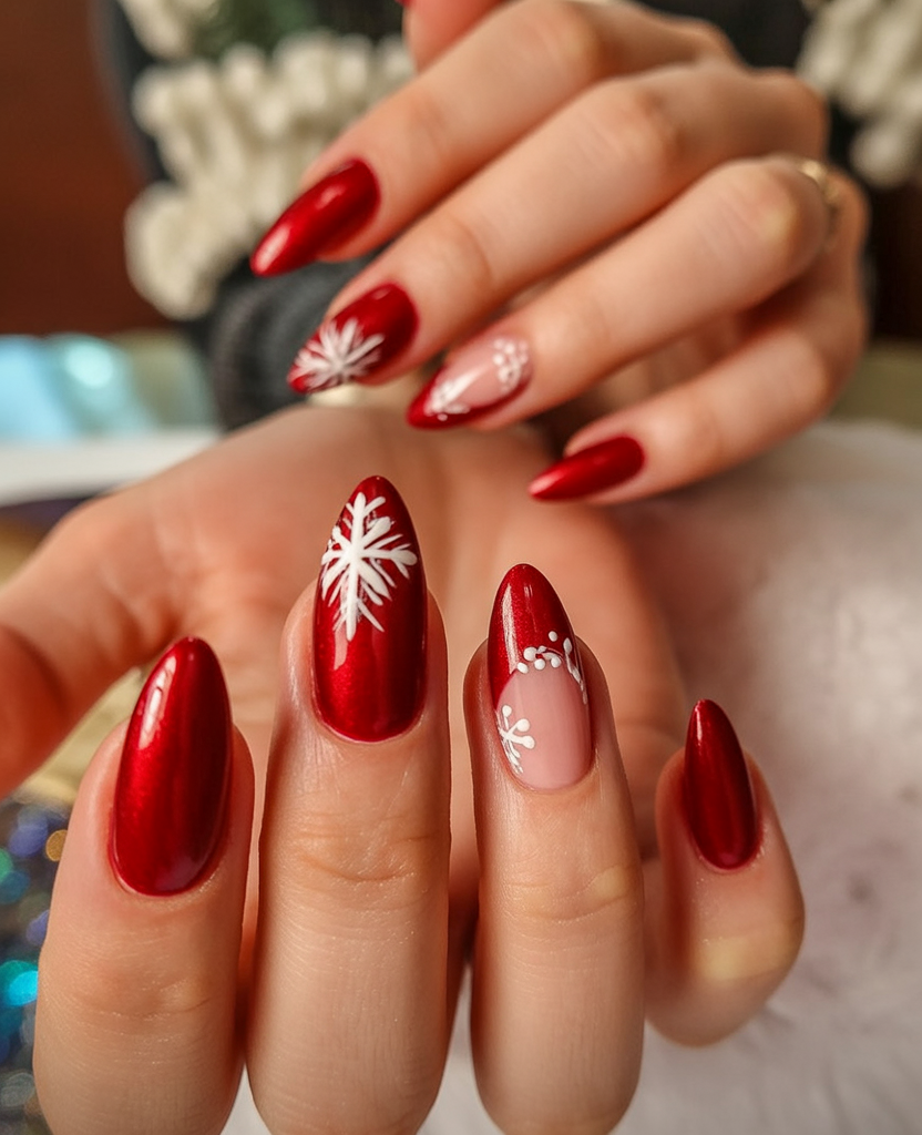 8. Shiny Red Almond Nails with Snowflake Art