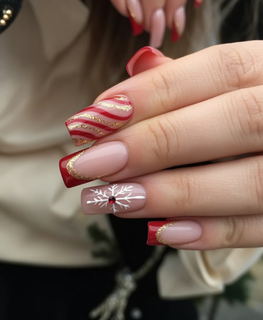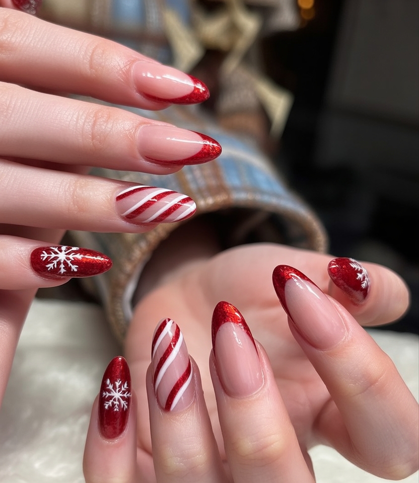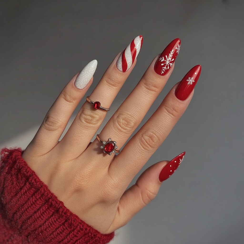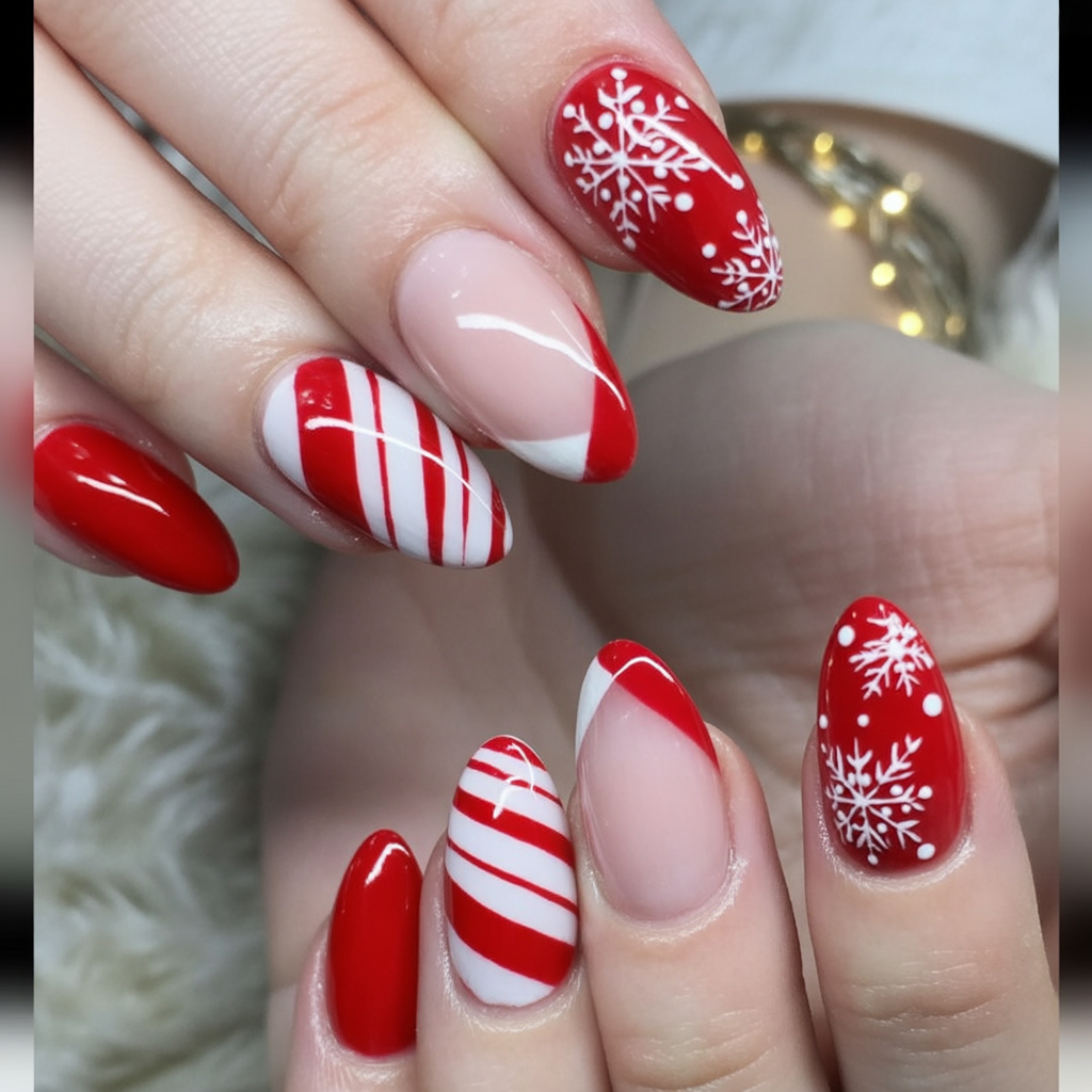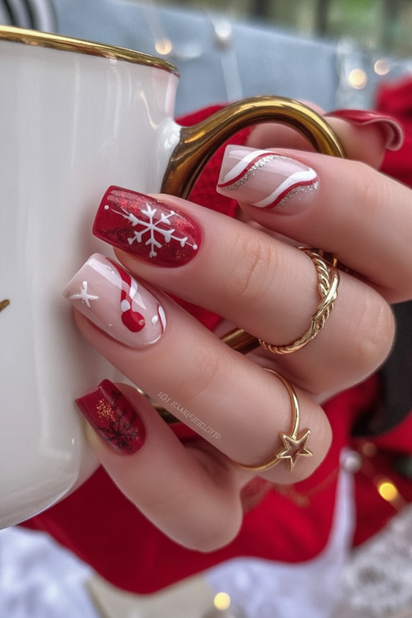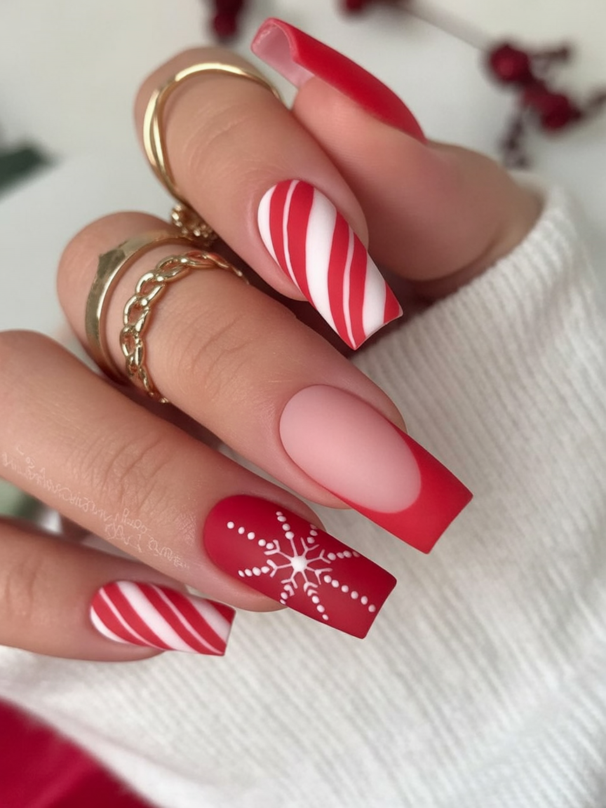 This design is a holiday card come to life, mixing glossy reds with peppermint stripes and delicate snowflake art. The alternating designs give a fun, festive vibe that really gets one into the holiday spirit. It’s cheerful and bright, just right for a little bit of fun during winter celebrations.