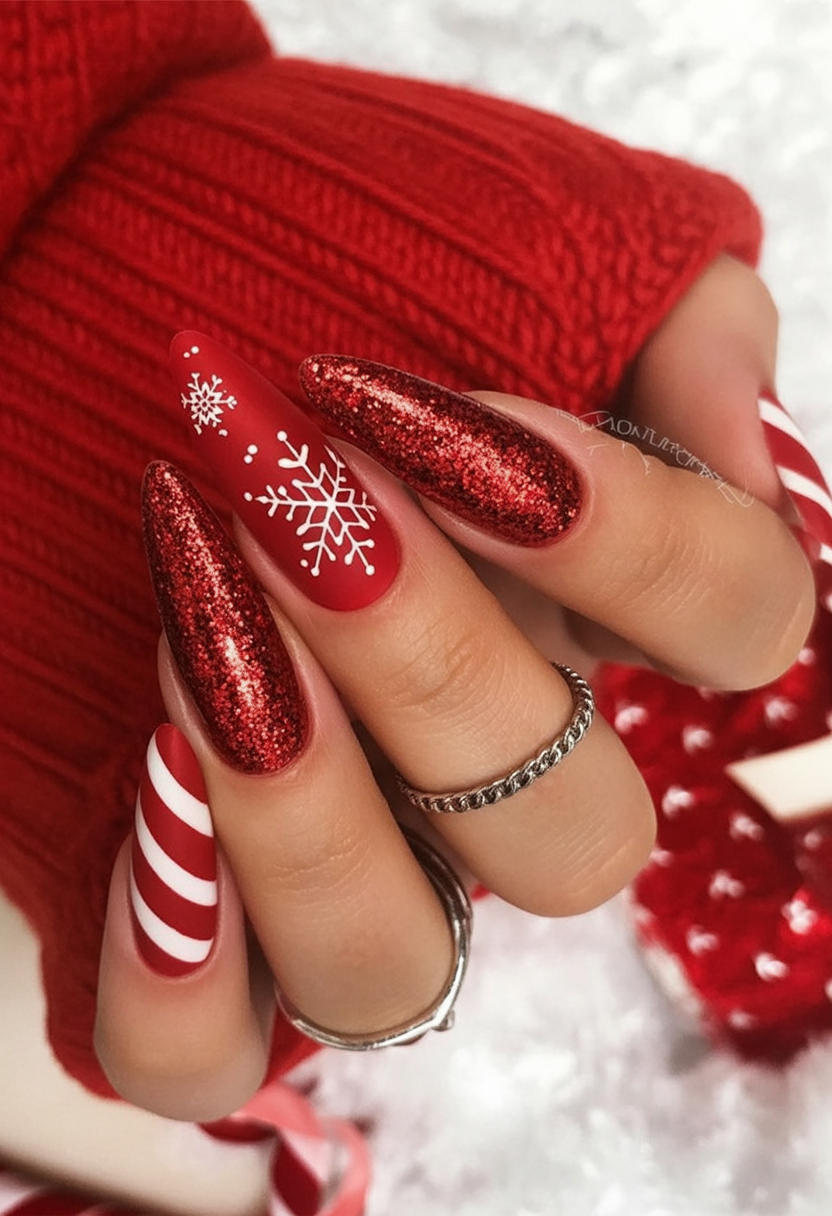 This is the style to consider if one likes classy Christmas inspiration with a dash of fun, mainly if applied on almond-shaped tips of acrylic or natural nails with some length. Their glossy surface gives them a go-to appeal and thus something that pairs from an over-sized sweater to a little black dress, ensuring some every-day versatility through winter. It is minimalistic yet has flair to carry off trendy.Red Christmas nails 2025 are more than just a seasonal polish—they’re a statement of style, confidence, and festive joy. Whether you go for glitter, bows, candy stripes, or a simple glossy red, each design lets you celebrate the holiday spirit in your own unique way. Wear them to family gatherings, office parties, or even just to treat yourself, and let your nails sparkle as much as the season does.