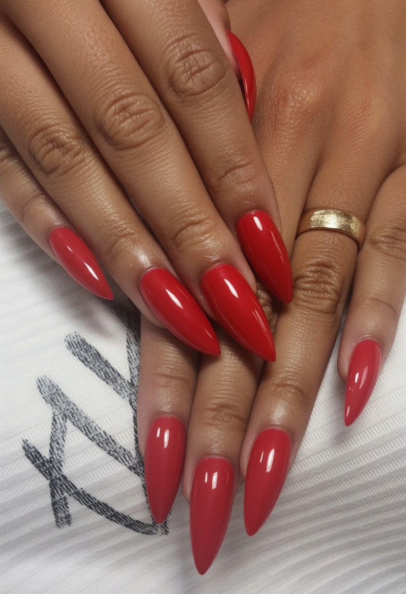 18. Sleek Red Almond Nails