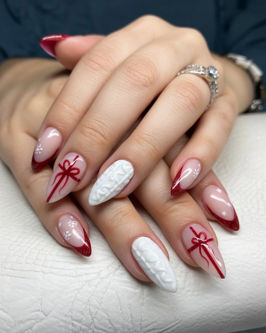 5. Red, White Bows, and Sweater Texture Nails