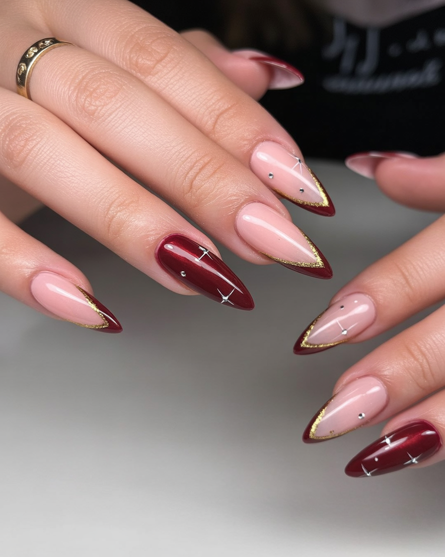 The style is sleek and elegant, featuring deep red polish-to-nude colors with golden edges. Small silver stars add a sparkling and modern twist that will make these nails feel incredibly chic and fashion-forward in 2025.
