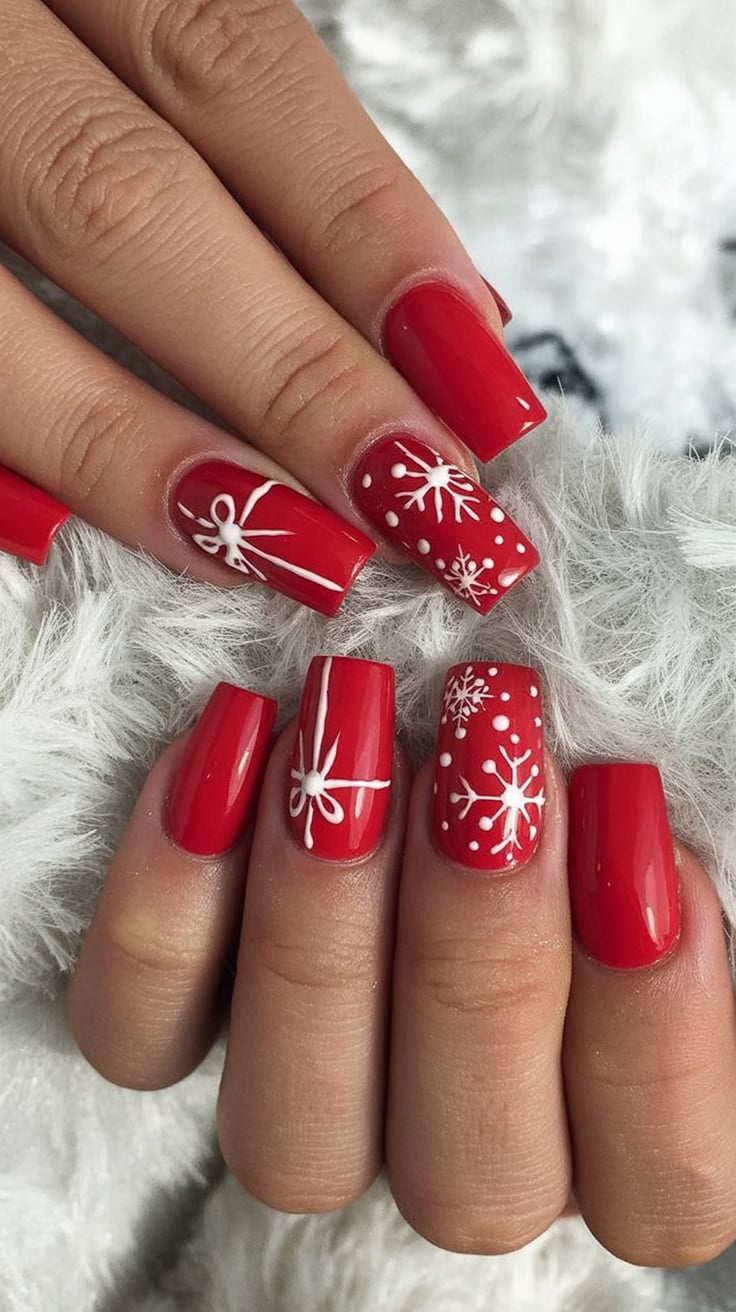 7. Classic red square nails with snowflakes and bows