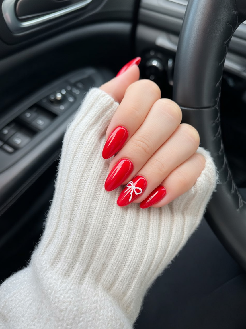 11. Glossy Red Almond Nails with a Cute Bow