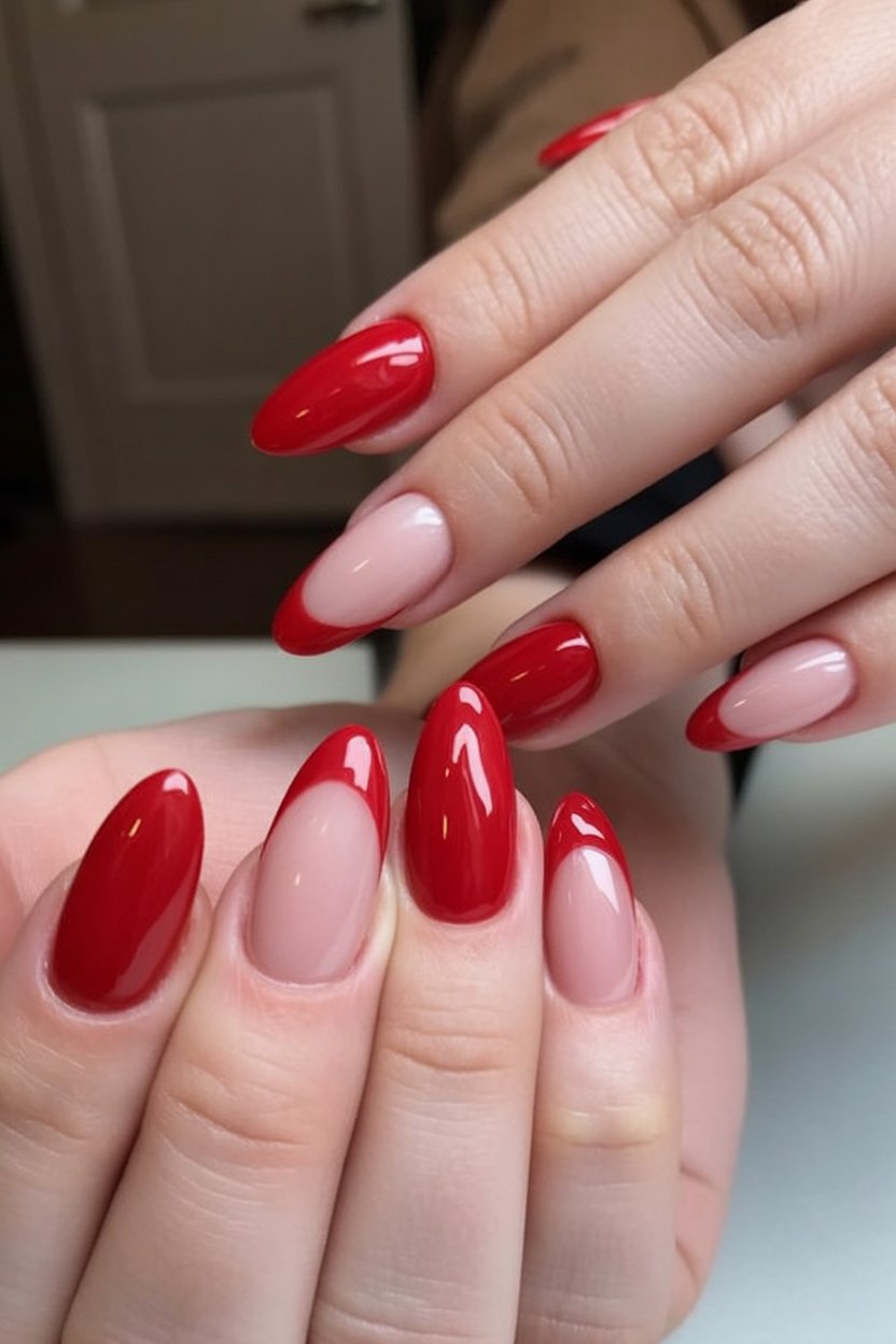 21. Red Almond Nails with Reverse French Tips