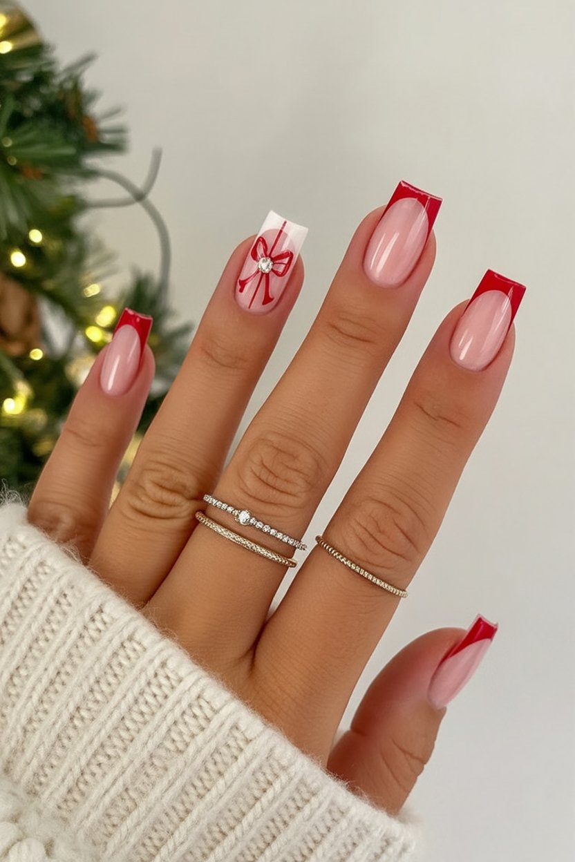 9. French Red Tips with Holiday Bow Accent