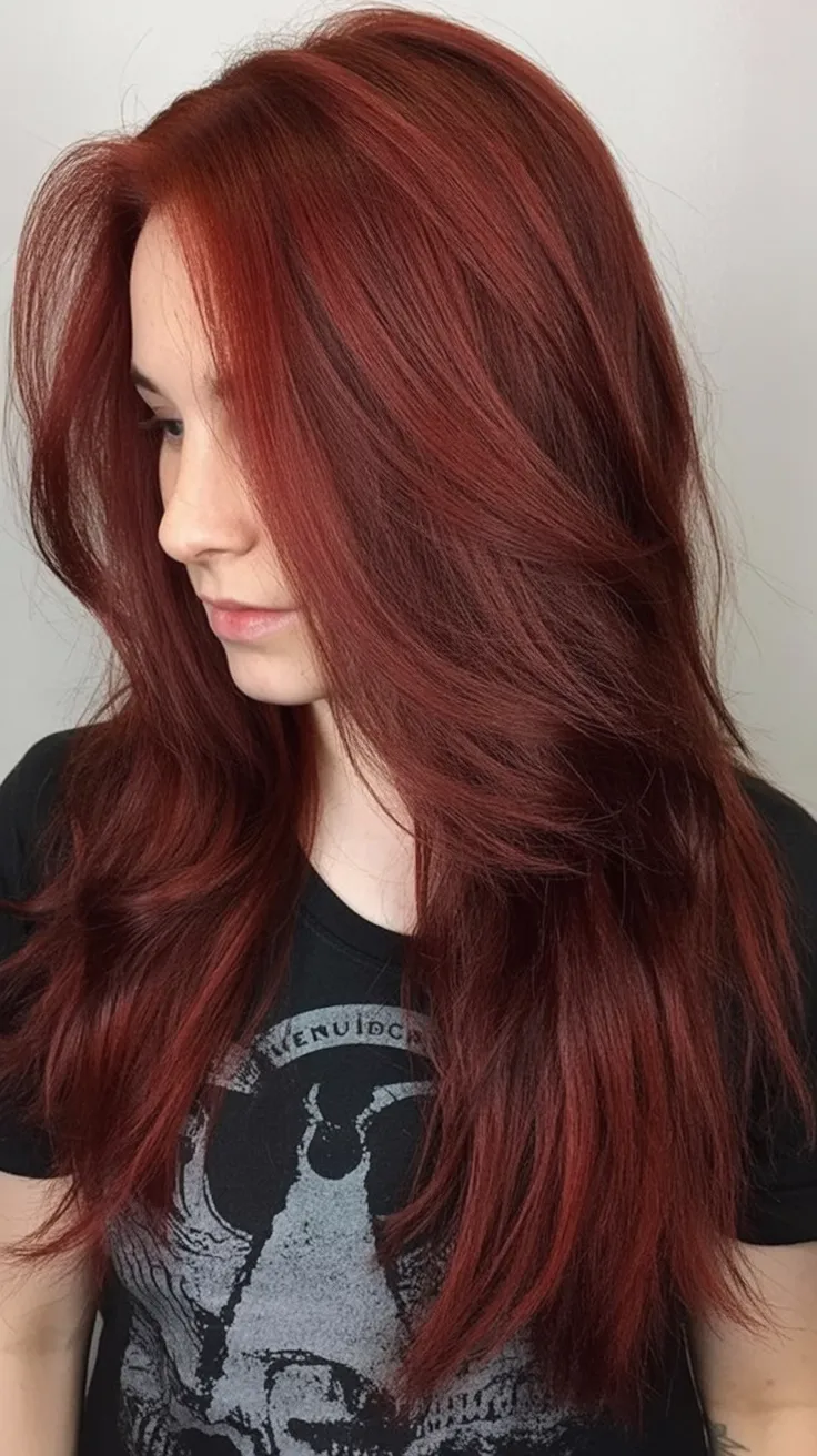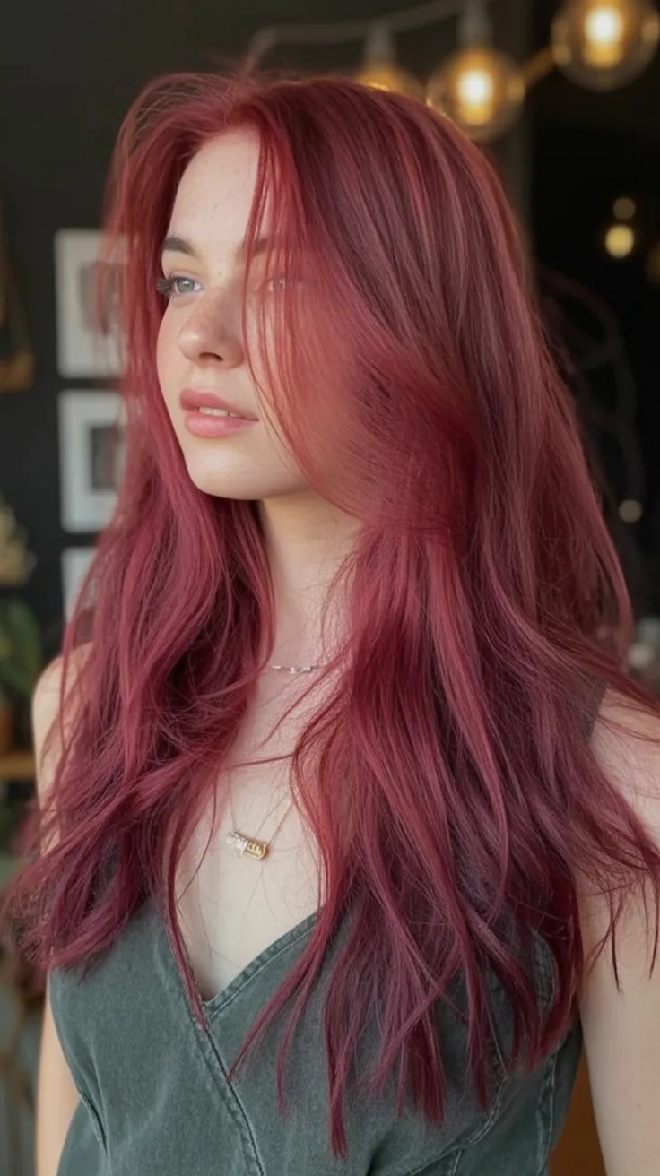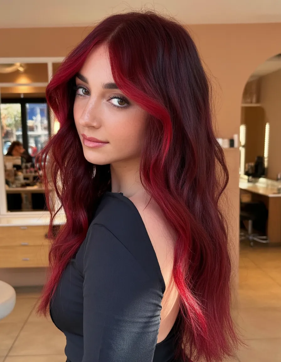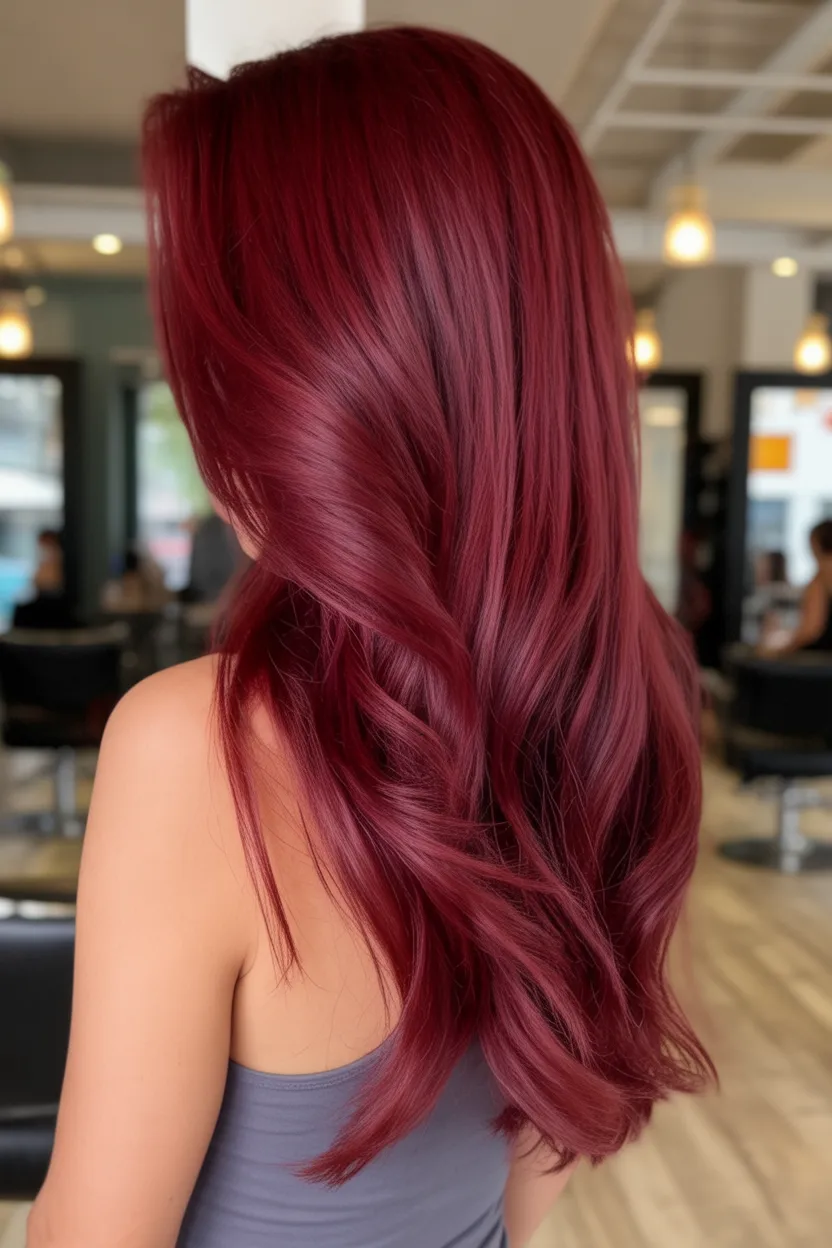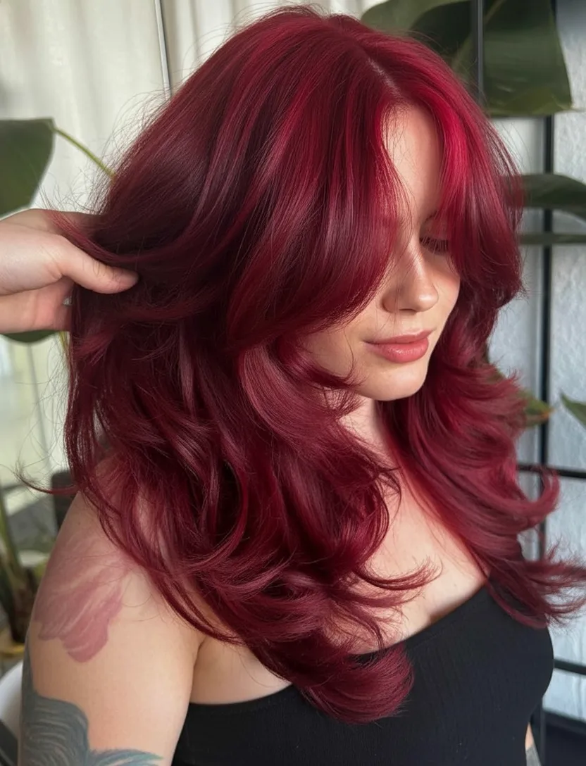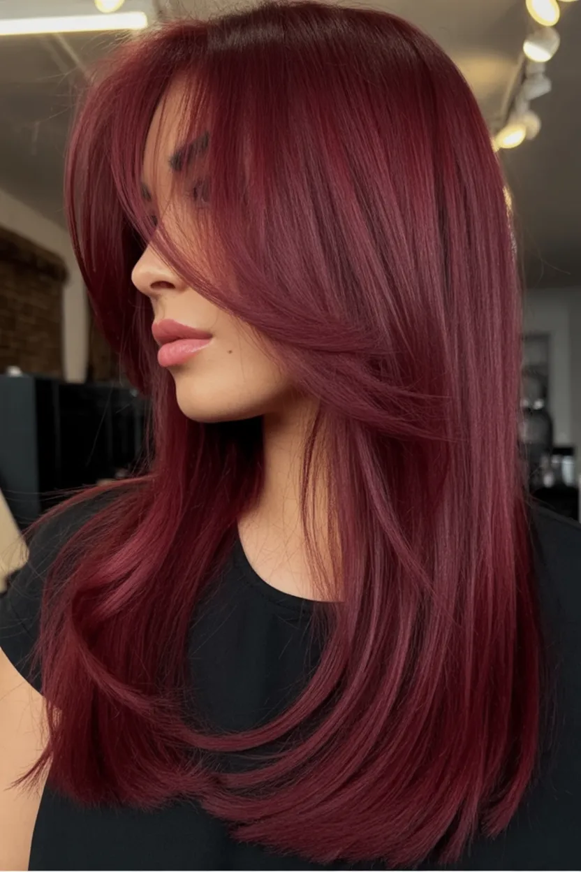 Who it’s for: women with medium to thick hair (or fine hair with decent density) who want movement without losing length. Long layers keep the Dark cherry tone from looking heavy, and soft waves show off the dimension. Ask for a Ruby-leaning base with subtle highlights if you want extra lift through the mid-lengths. A weekly color mask and a shine serum will help this dye stay deep and reflective instead of fading dull.
