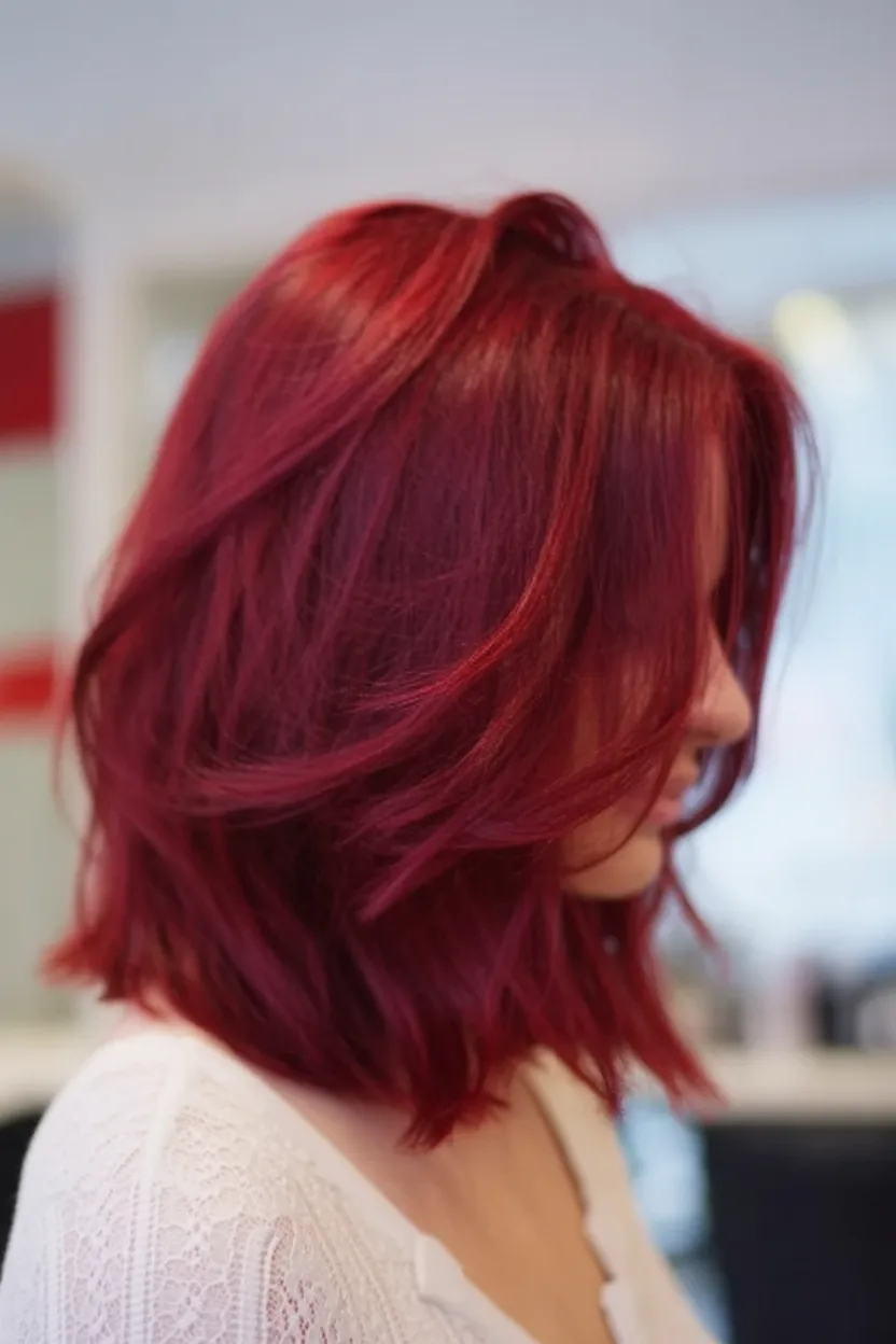 This is the kind of red that feels like a little secret you’re keeping—rich, glossy, and quietly dramatic. It doesn’t scream; it just glows when the light hits, like you’re wearing confidence instead of hair color. The vibe is polished but not precious, the kind of shade that makes even a plain black top look intentional and a little luxe.
