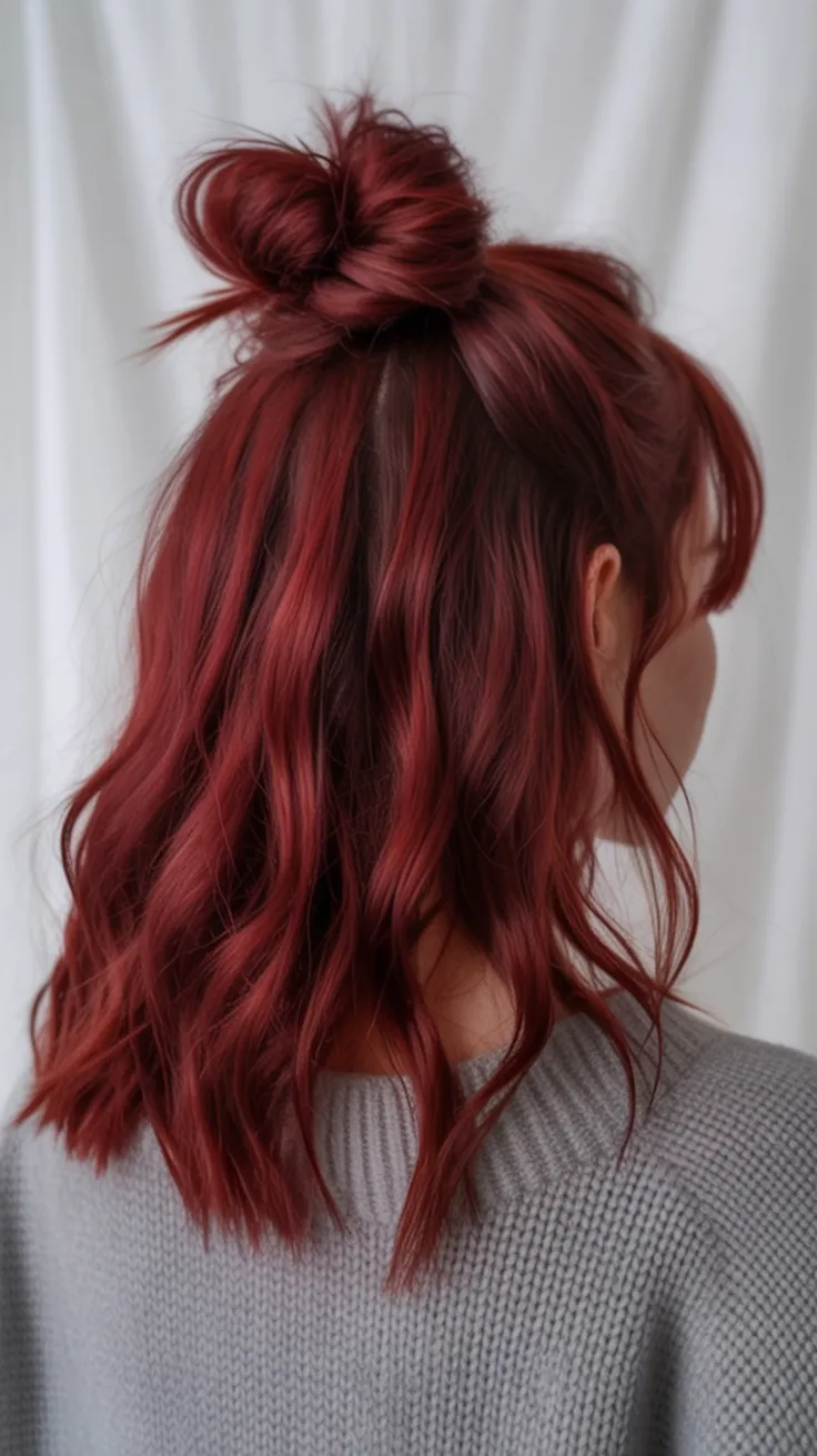 This one is cozy-cute with a hint of mischief—the kind of style that makes you look like you casually have your life together. The half-up moment gives that “face is open, mood is light” effect, while the Auburn tones keep it warm, romantic, and a little artsy.