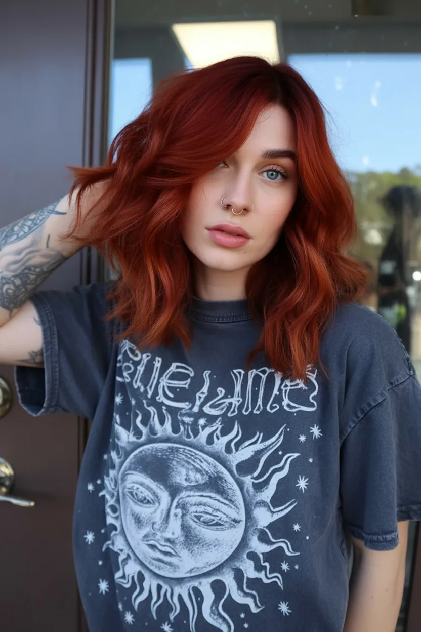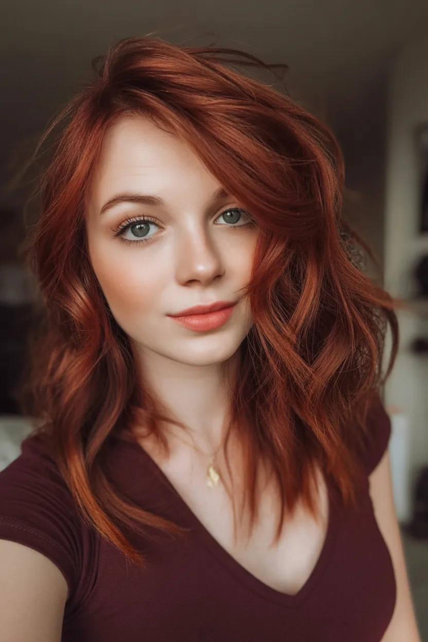 If you’ve been sitting on the idea of going red, take this as your sign. Shoulder length makes it easy to manage, and the loose texture keeps the look relaxed even when the color is Bright. It works on straight, wavy, and lightly curly hair—just adjust your styling (diffuse for curls, bend with an iron for straight hair). For brunettes, this is a great “first red” if you add a deeper base underneath so the grow-out feels natural.