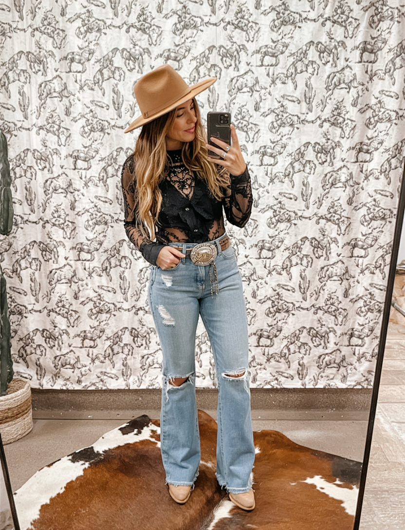 If you’re craving inspiration to elevate your usual jeans-and-top combo, this is it. The lace top adds just enough drama for spring or fall rodeos, and the flare jeans elongate the legs in the most flattering way. Add brown boots for a final 2026-ready touch.