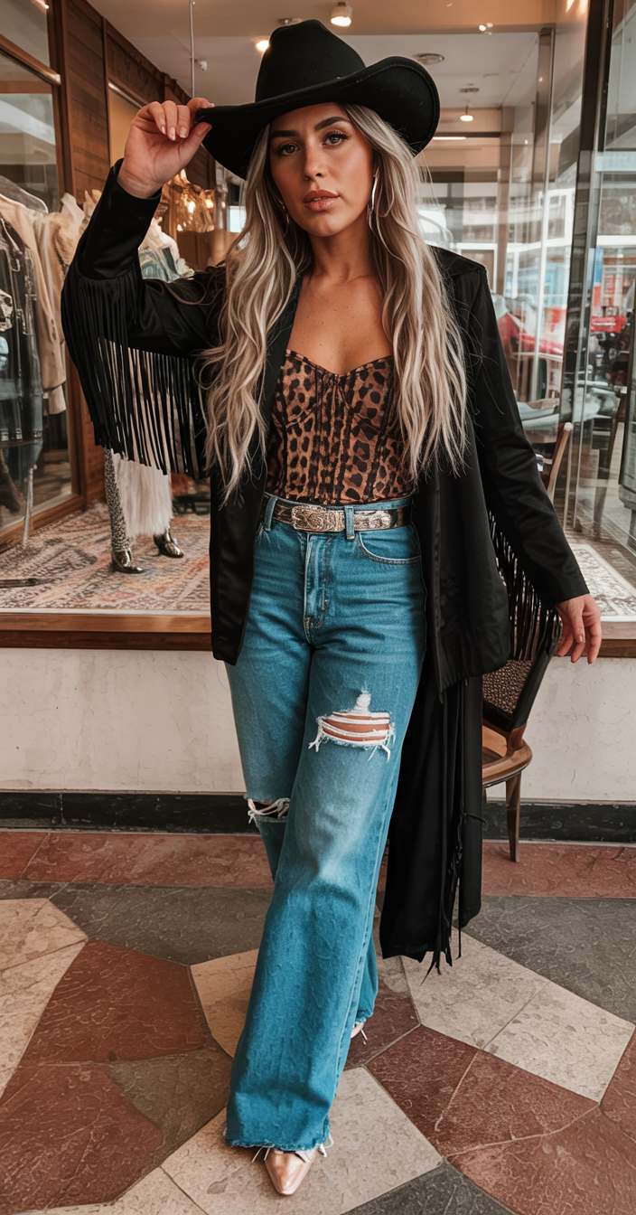 This outfit brings pure baddie energy—the kind that makes you stroll into the venue like you already know you’re going to have the best time. The black hat, the fringe jacket, the leopard corset… it’s dramatic in the sexiest, most Western way. It’s a statement without saying a single word.