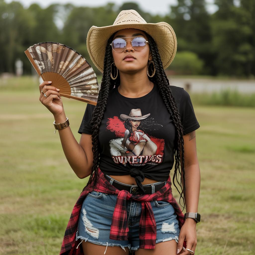There’s something instantly empowering about this look—the kind of outfit that makes you stand a little taller and smile a little wider. The mix of graphic tee, denim layers, and those unforgettable red boots brings a playful confidence that feels perfect for a Texas day filled with music, dust, and pure Western country cowgirl fashion. It’s casual but still has that little spark that turns heads without trying too hard.