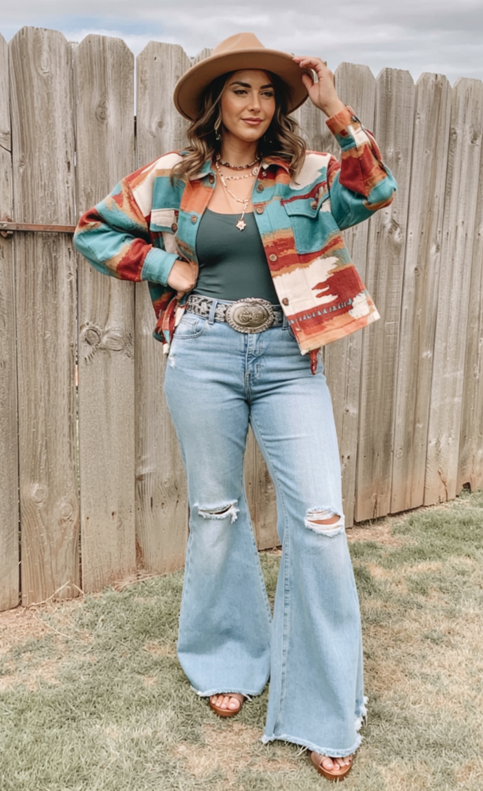 This layered look has all the warmth and charm of a fall afternoon spent outdoors. The patterned jacket, soft tank, and flared denim give a laid-back Western mood that’s effortlessly cute. It feels comfy, approachable, and perfect for breezy days.