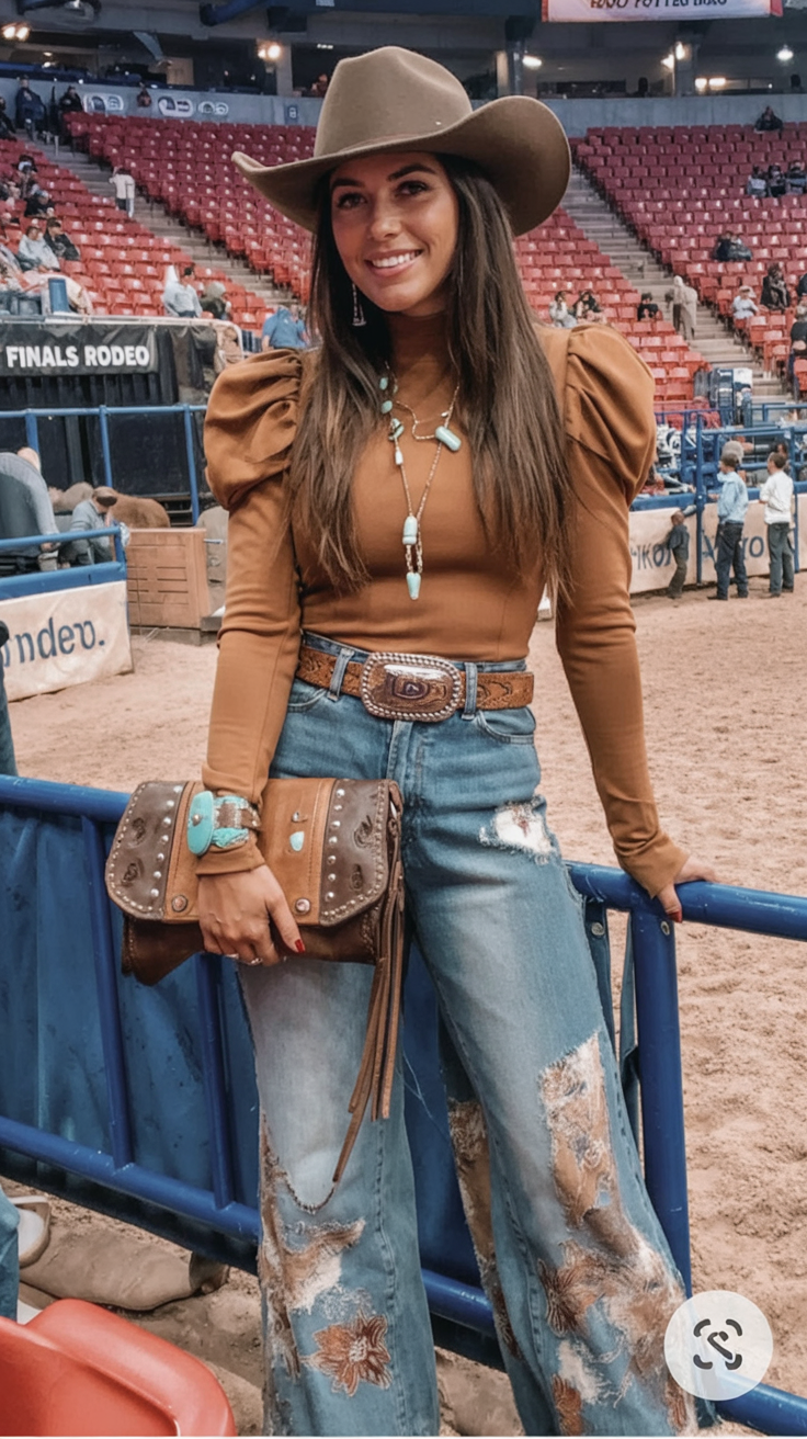 This look feels like stepping into a big rodeo weekend with all the excitement you’ve been waiting for. Between the puff-shoulder top, artisan jewelry, and embroidered denim, the outfit blends tradition with a chic, modern twist. It’s bold, rich, and full of that unmistakable Texas attitude.