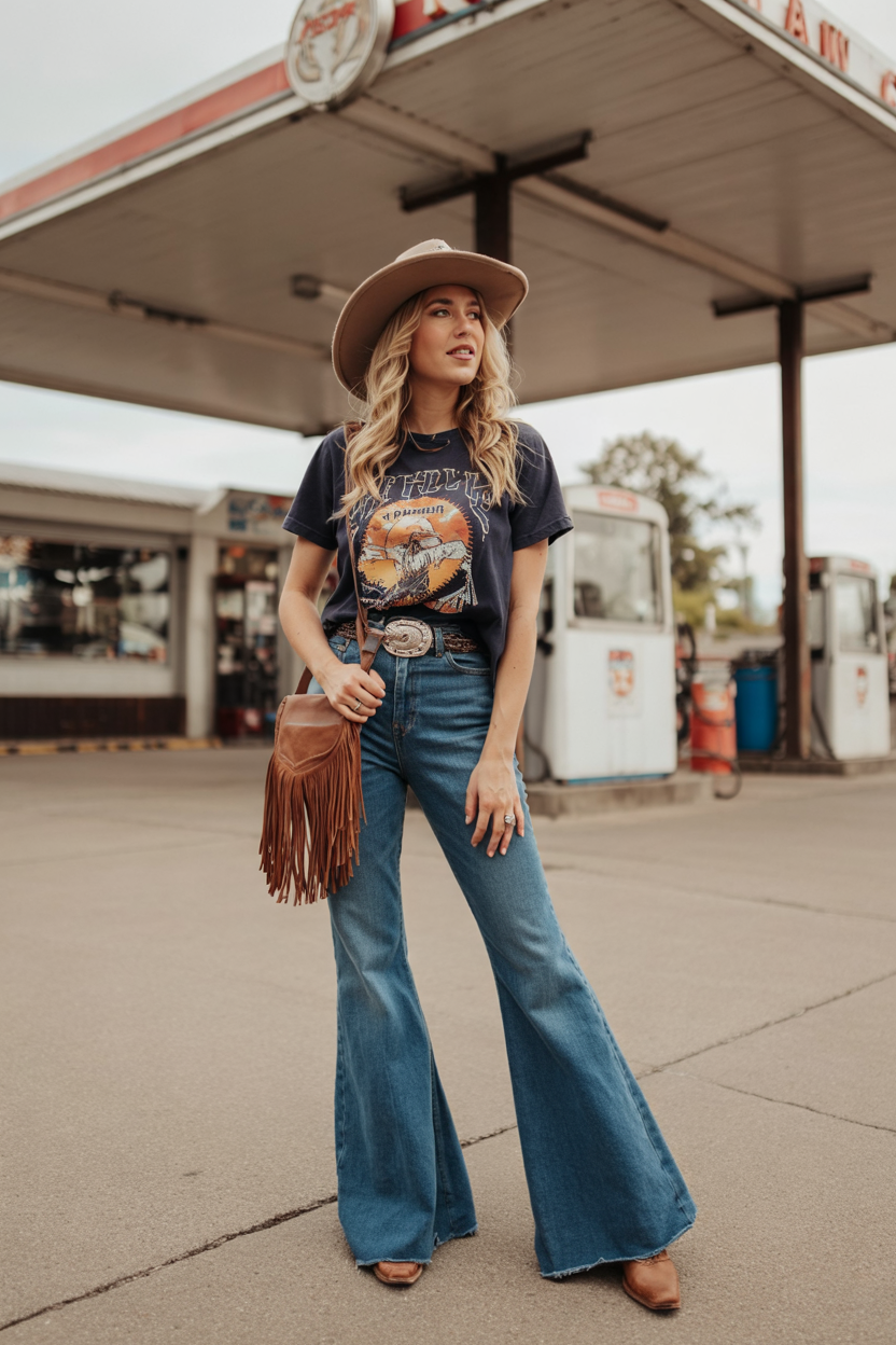 This outfit feels like the heart of Western country cowgirl fashion—the graphic tee, the fringe bag, the flared denim… It’s casual, cute, and effortlessly confident. There’s a nostalgic sweetness to it that instantly makes you think of road trips, gas station stops, and warm summer nights.