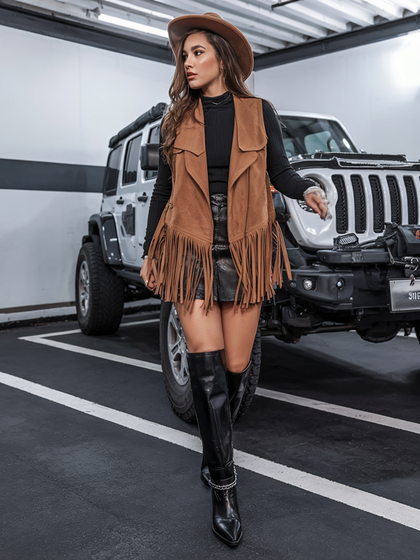 If you love outfits with presence, this one stands out. The long fringe vest adds movement that flatters all heights, and the tall black boots give the whole look a powerful, chic silhouette. Wear it for fall nights or party events when you want that extra spark.