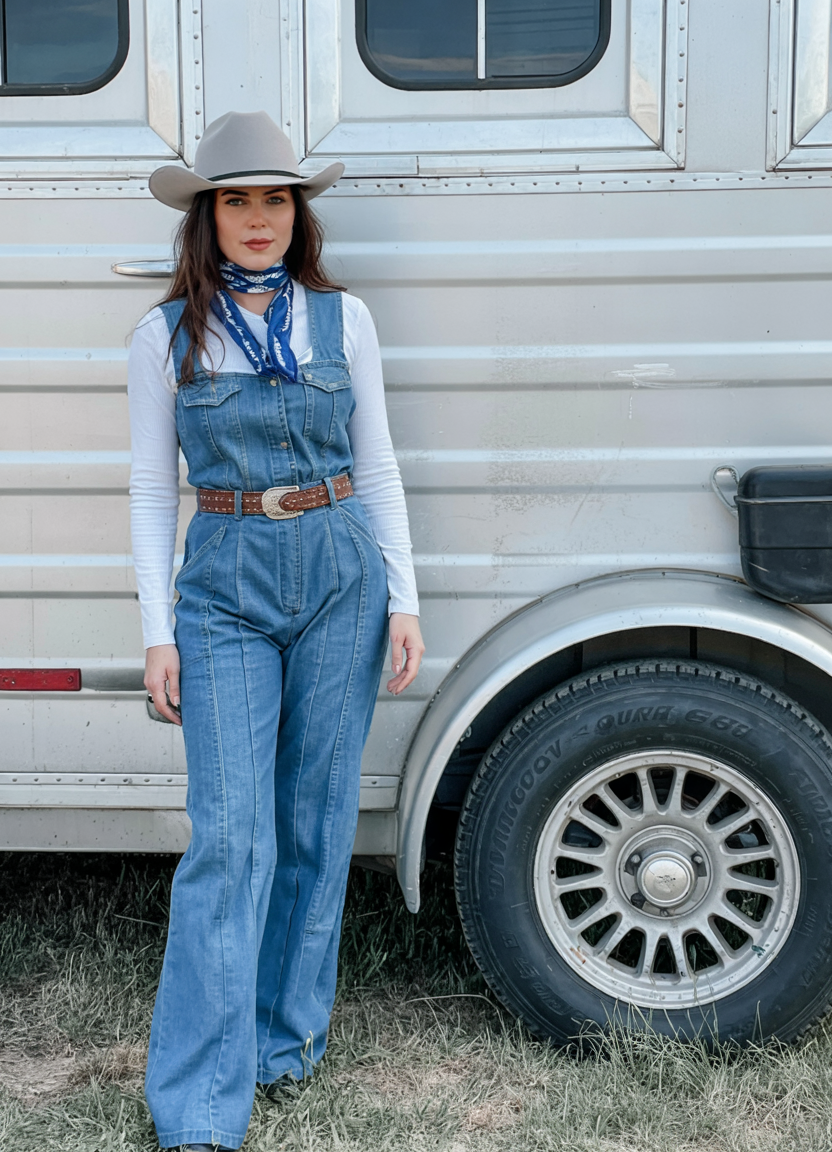 This look carries the calm, grounded charm of a quiet morning at a Houston arena—polished, modest, and timeless. The denim jumpsuit paired with a soft scarf and wide-brim hat gives off the kind of Western style that never feels forced. It’s Western country cowgirl fashion in its most classic form, striking that perfect balance between feminine and strong.