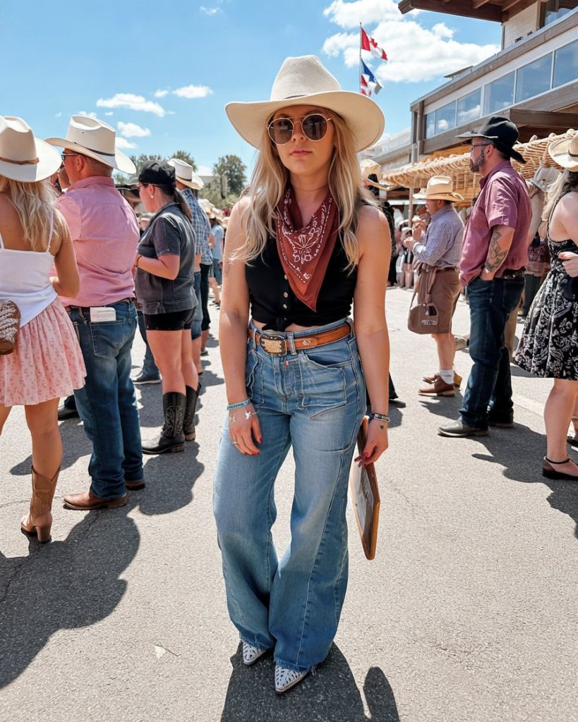This outfit brings pure summer rodeo confidence—the kind where the sun hits just right and you feel effortlessly stylish among the crowds. The black top and knotted bandana add a touch of Western edge, while the wide-leg jeans soften everything into a comfy, breezy look. It feels light, approachable, and perfect for all-day events.