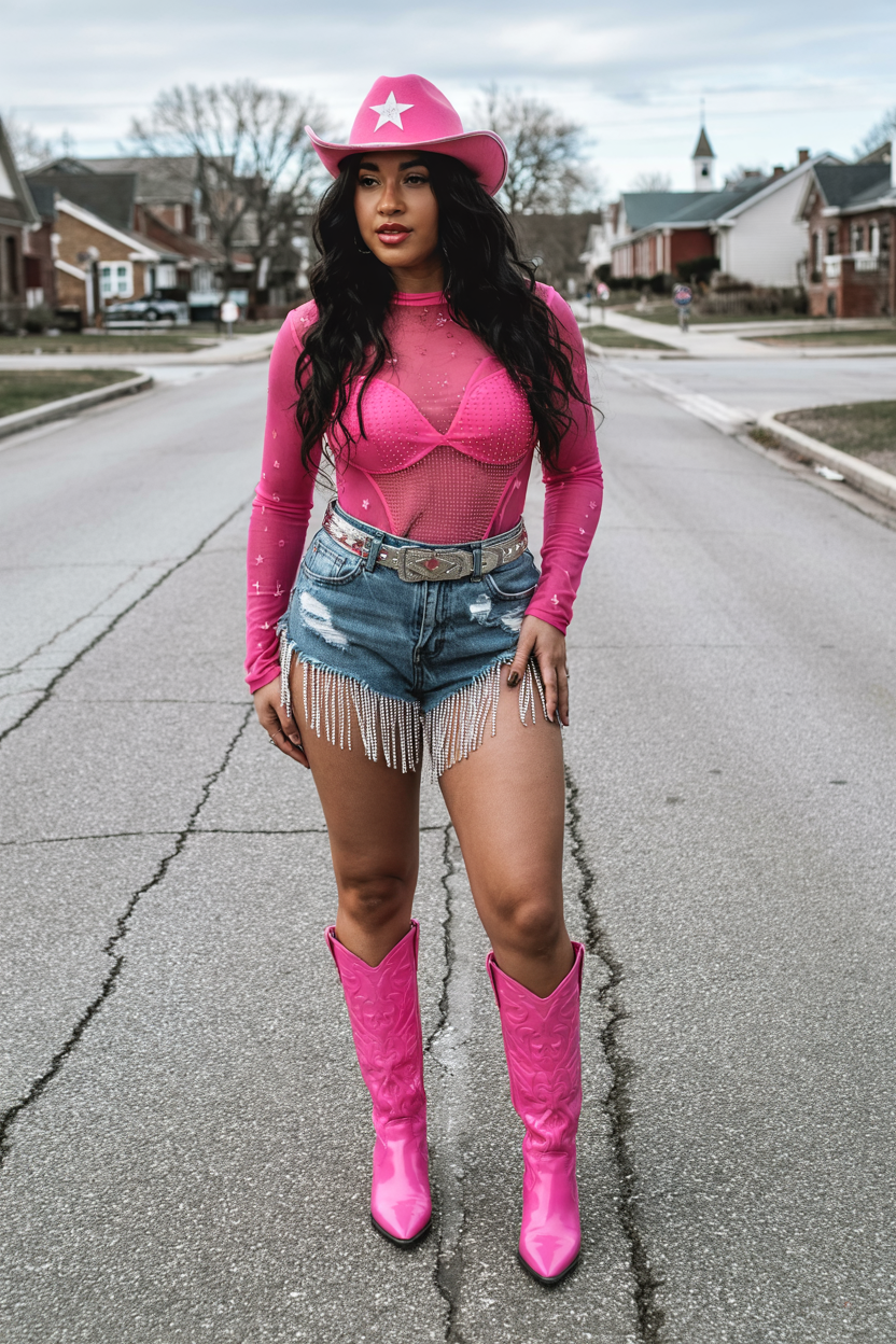 This outfit radiates pure party confidence—the kind of energy that turns a regular rodeo into an unforgettable summer moment. The sparkling mesh, the denim shorts with fringe, and that bold pink hat come together in a way that feels unapologetically fun and wonderfully chic. You can almost hear the music beating under the stadium lights.
