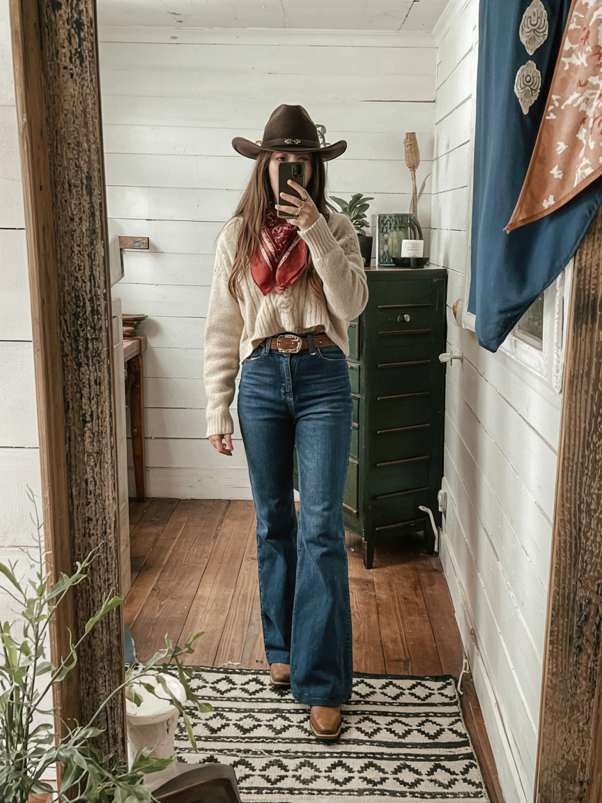 15. Cozy Sweater & Bandana Fall Rodeo Look
