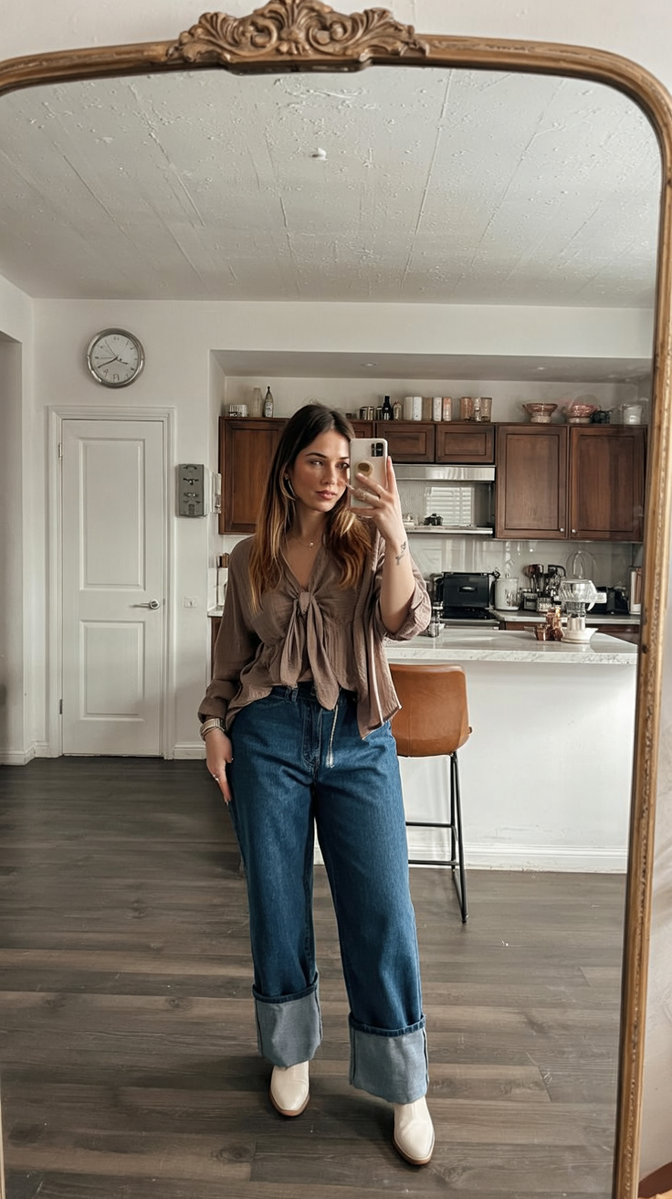 This look has such a relaxed, lived-in sweetness—like something you’d wear when you want to feel comfortable but still put-together. The loose neutral blouse and the dramatic cuffed jeans bring a fresh twist to Western country cowgirl casual fashion without leaning too hard into anything costume-y. It has that clean, calming energy that works beautifully indoors or outdoors.
