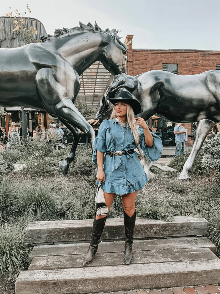 There’s something undeniably magnetic about this denim-dress moment—it feels like the perfect mix of confidence, softness, and Western attitude. The flowy sleeves and cinched waist give the whole look a breezy movement that fits right in with the energy of a summer rodeo or a Houston weekend out. Paired with black boots and a wide-brim hat, it creates that effortlessly chic vibe that feels both playful and grown-woman polished.