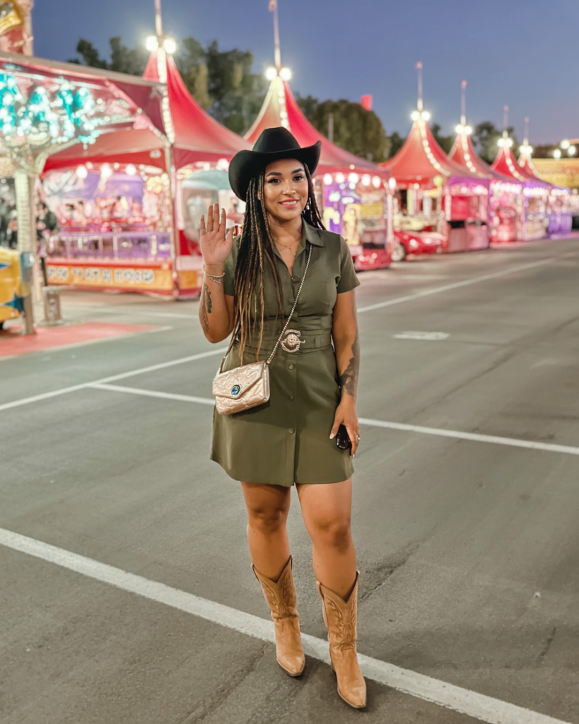 There’s something irresistibly simple and classy about this olive dress paired with a black hat. It brings a fresh twist to Western country cowgirl fashion—modest enough for a family night, but still stylish enough for a fun fair date. The warm lighting makes the outfit glow beautifully.