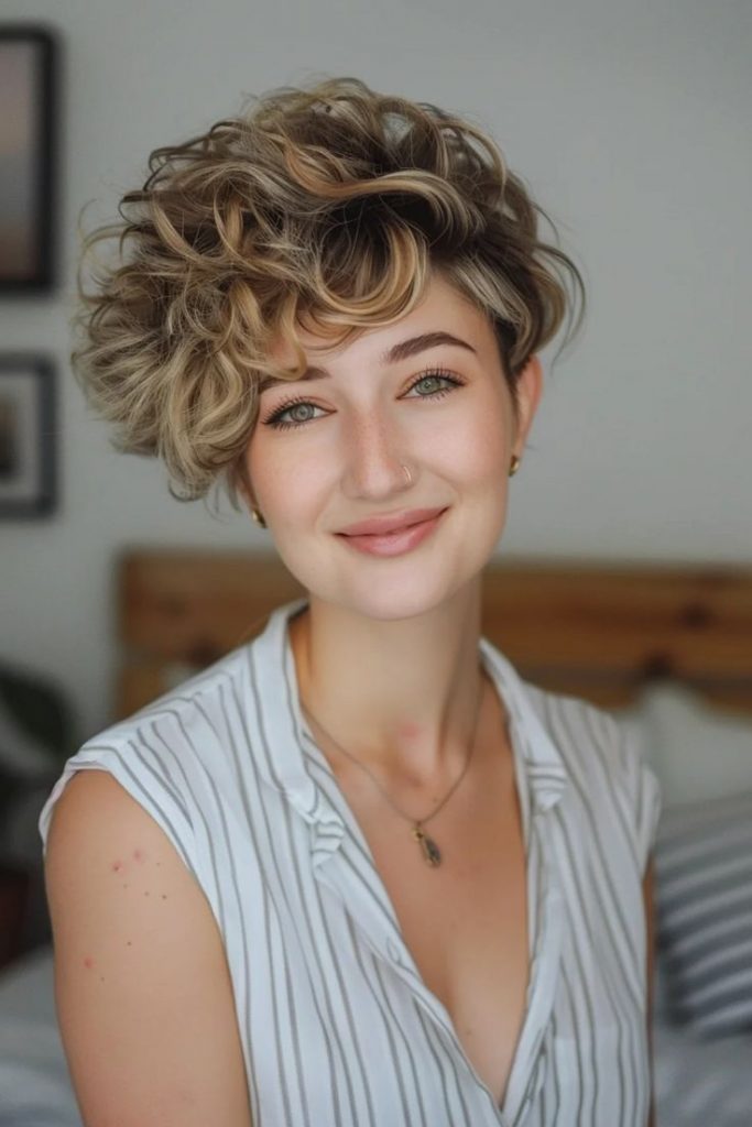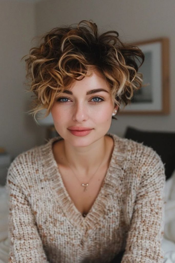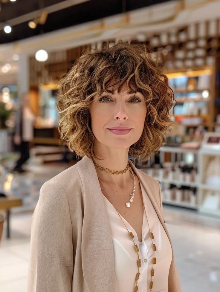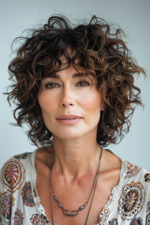 This very stylish tousled curly haircut showcases short, voluminous layers with soft highlights that frame the face beautifully. It’s perfect for women over 50 looking for a youthful yet sophisticated look. The curls add texture, while the layering creates a natural bounce that’s universally flattering. This style is ideal for round faces or round chubby faces, as the layers elongate the appearance of the face.