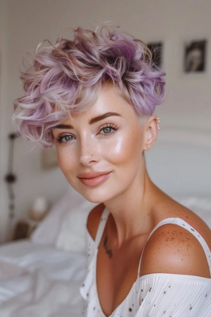 Pastel hues are all the rage, and this lavender curly pixie is the epitome of boldness and creativity. The shaved sides enhance the top’s fluffy curls, making it perfect for masc women or anyone looking to make a statement. The color itself complements a variety of skin tones, adding a playful yet refined touch.