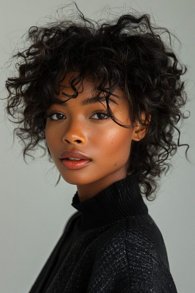 This curly haircut radiates natural beauty and effortless style. Perfect for natural black women, the tousled curls frame the face softly while adding volume and movement. It’s an ideal choice for anyone embracing their natural hair texture in a chic and manageable style.