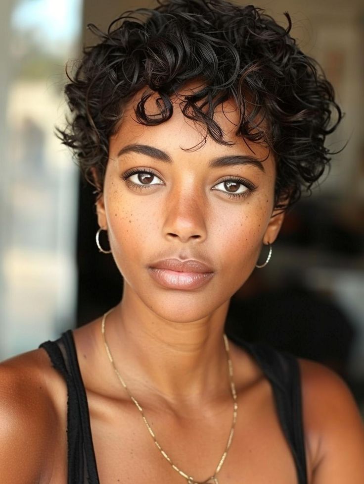 Vintage meets modern with this short, curly pixie cut. The defined curls bring a retro charm, while the layered structure ensures it remains fresh and contemporary. It’s perfect for round faces pixie cuts, offering a sleek, glamorous look.