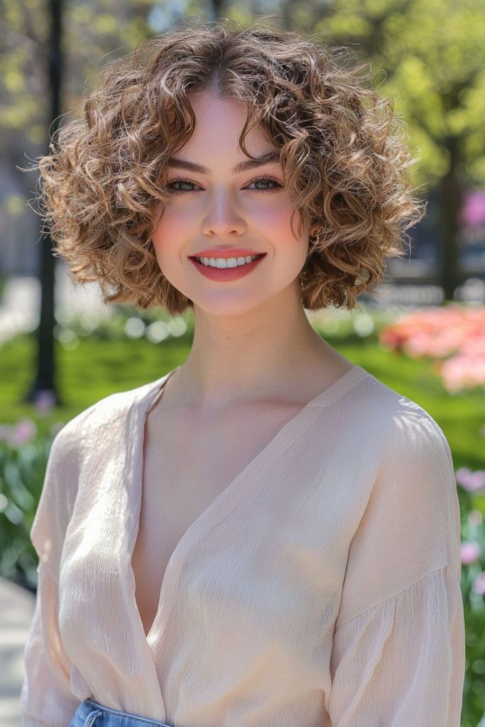 This sun-kissed curly bob is perfect for women looking for a casual yet polished style. The warm golden highlights add depth and dimension to the layered curls, making this cut a versatile option for round chubby faces. It frames the face beautifully while giving off a youthful and vibrant vibe.