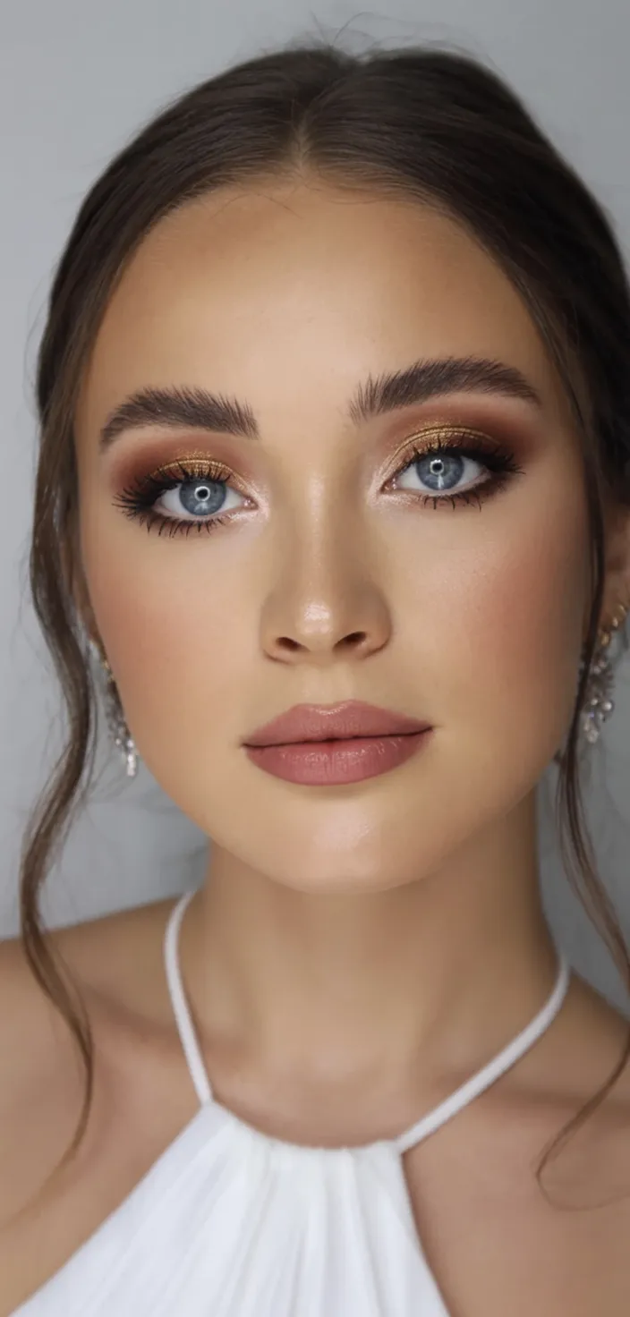 This look is especially good for wedding dinners, for graduation photos, or for prom if you want glamor that won’t feel dated in six months. Use champagne or soft gold shimmer on the lid, blend a medium brown through the crease, and keep the lip in the nude family so the eyes stay center stage. Blue eyes really pop with these warm metallic tones, but it also flatters Brown skin and fair complexions alike. Compared with a heavier smoky eye, this version feels lighter, softer, and much more wearable, especially if you want something that photographs beautifully from day into evening.
