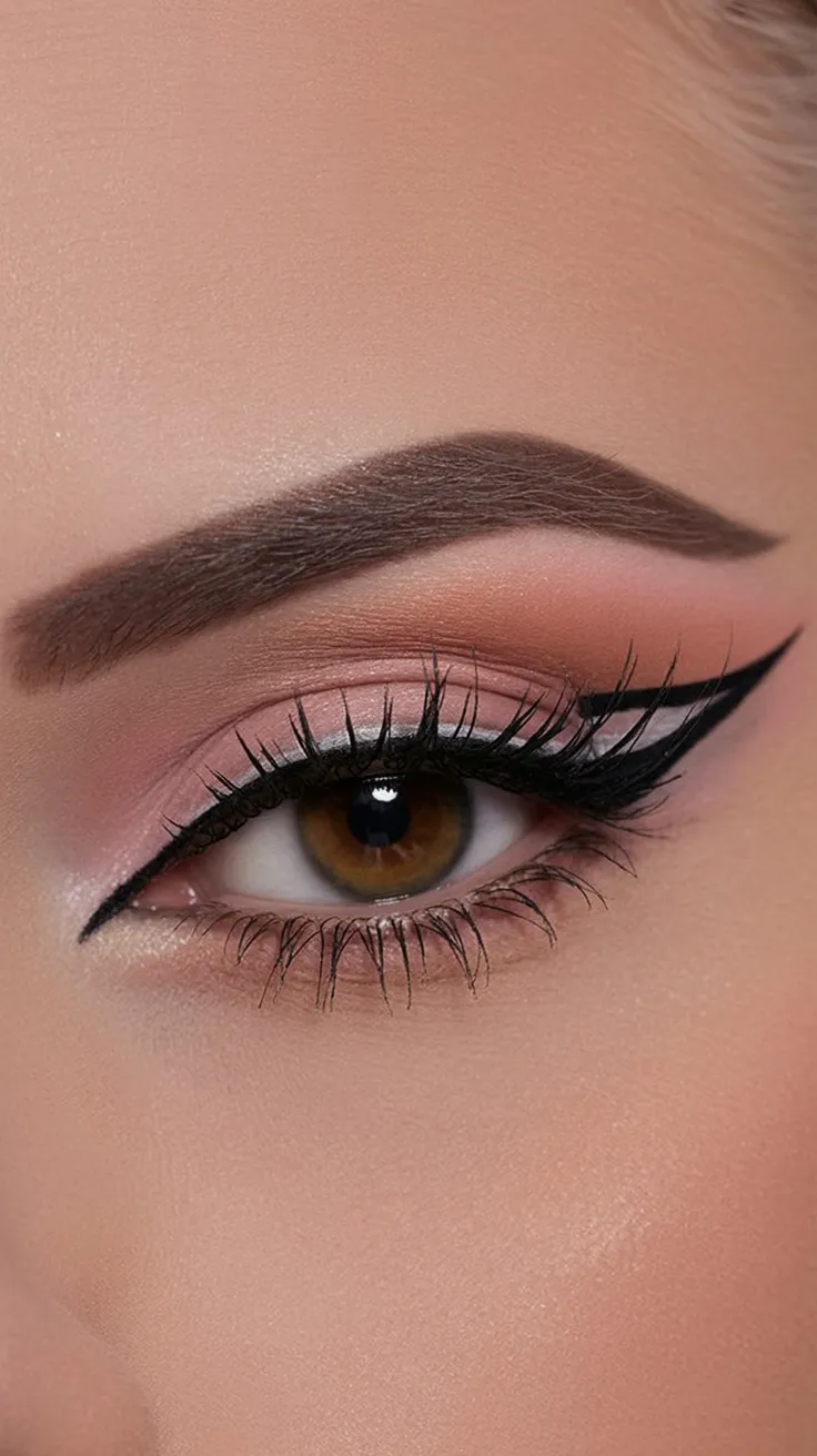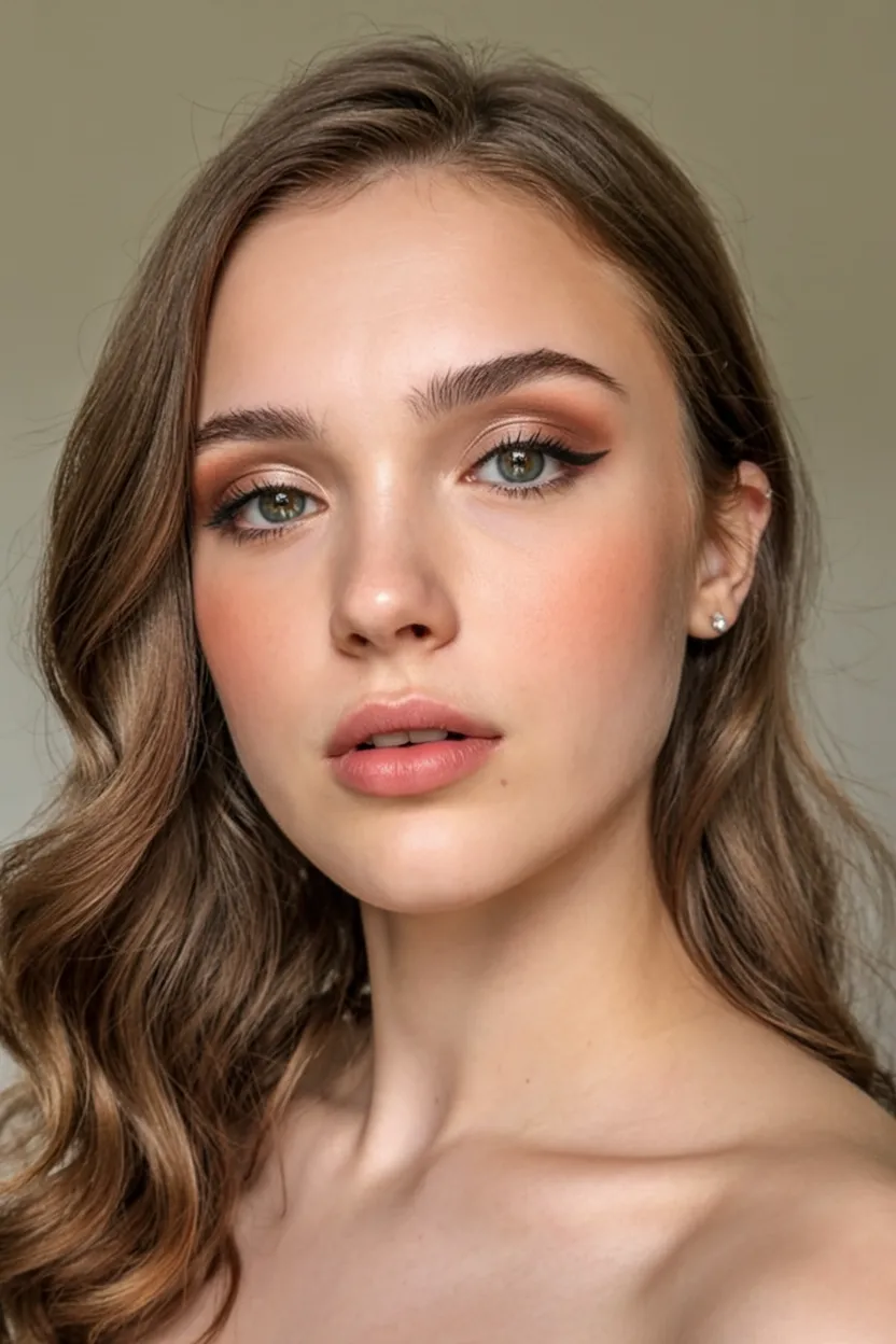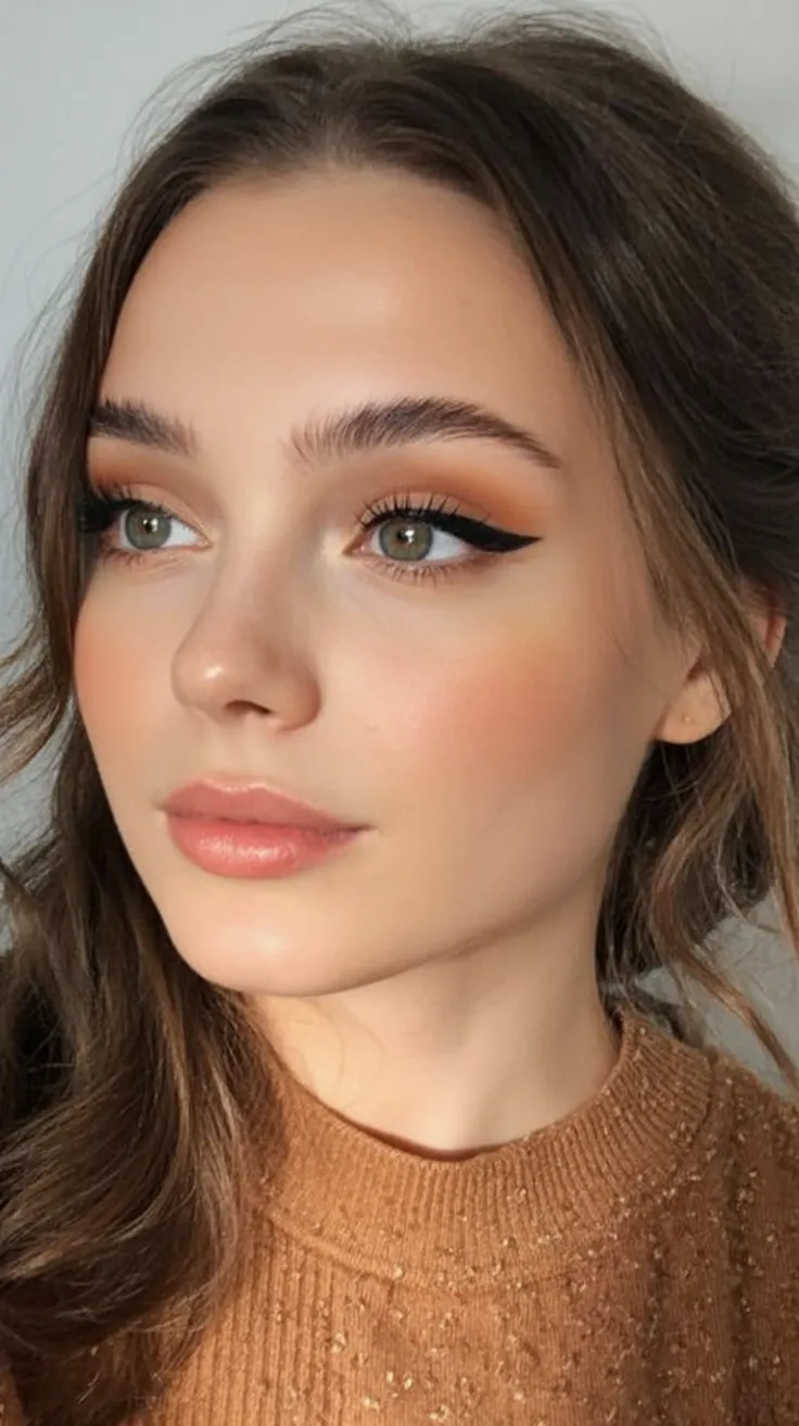 The vibe here is confident, feminine, and just a touch more intentional than a no-makeup makeup look. It’s especially flattering on hazel and Brown eyes because those warm neutrals make the eye color glow without needing sparkle or heavy shadow. Use a matte caramel or peach-brown in the crease, add a fine black wing, and finish with a natural lip. This look pairs beautifully with a camel sweater, gold earrings, and simple waves, so it works just as well for daytime as it does for dinner. If you like classic makeup with a little attitude, this one absolutely delivers.