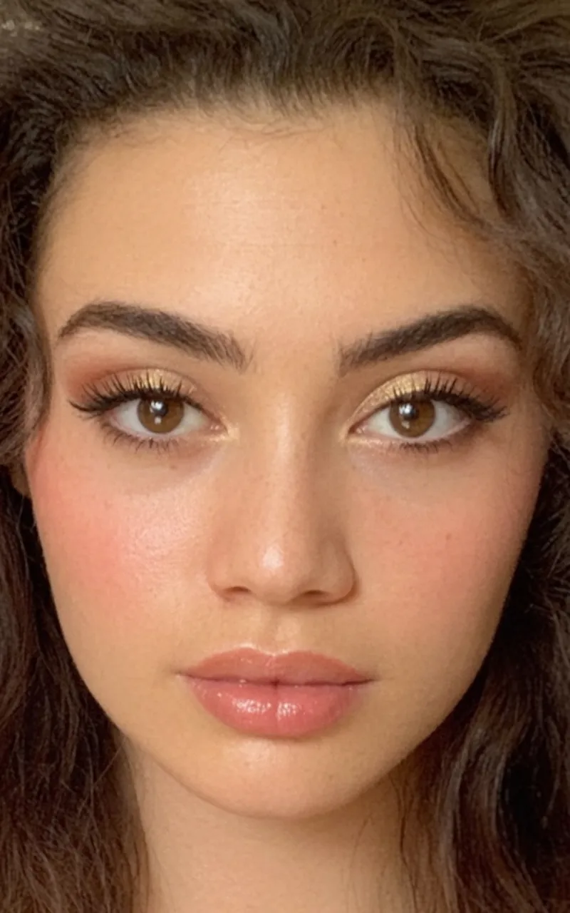 Some looks feel instantly uplifting, and this one absolutely does. The golden shimmer across the lids brightens the whole face in such a flattering way, while the soft pink cheeks and glossy lips keep everything youthful and smooth. It has that warm, lit-from-within effect that always looks expensive without needing a dramatic contour or a bold lip. There’s a softness to it, but also a sense of intention. You can tell every tone was chosen to flatter, not overwhelm. It’s the kind of makeup that makes you catch your reflection and think, “Okay, yes, I’m having a good face day.”