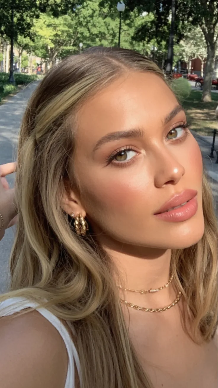 This look is perfect for summer plans because it pairs so well with lightweight clothes, gold jewelry, and sunlit skin. Think Wedding guest summer, brunch, a beach dinner, or daytime travel when you want to look pretty without feeling overdone. A glowy base, peach blush, bronzer, mascara, and nude balm are enough to create the effect. It suits most skin types, though a touch of powder through the center of the face helps if you get shiny. The best part is how natural it feels while still giving that little lift we all want when the sunlight hits our face.
