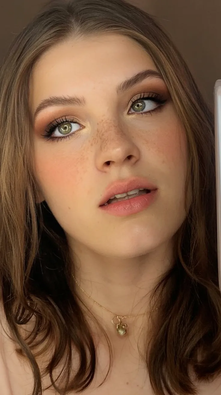 This look has that softly romantic, just-a-little-mysterious energy that always feels beautiful without trying too hard. The warm mocha shadow gives the eyes a deeper, more defined shape, while the natural skin and visible freckles keep everything grounded and fresh. I love makeup like this because it doesn’t erase personality—it actually lets it shine through. The finish feels gentle, feminine, and quietly expressive, like the kind of look you’d wear when you want to feel polished but still very much like yourself. It’s elegant without being stiff and flattering in that “why do I suddenly look so rested?” kind of way.