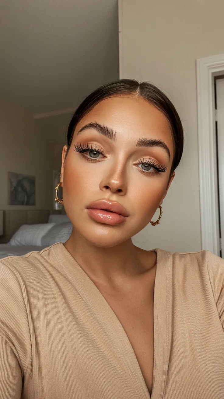This one suits women who like a bit more definition around the eyes and cheeks but still need their makeup to feel practical for real life. It’s gorgeous on medium to tan skin tones and especially flattering for Brown skin because the warm nude palette brings life to the complexion instead of washing it out. Pair it with a camel top, gold earrings, and a glossy lip for that clean, sophisticated finish. Unlike harsher contour-heavy glam, this version feels softer and more modern. It’s a lovely Wedding guest option too, especially if you want something natural enough for daytime and elevated enough for evening.