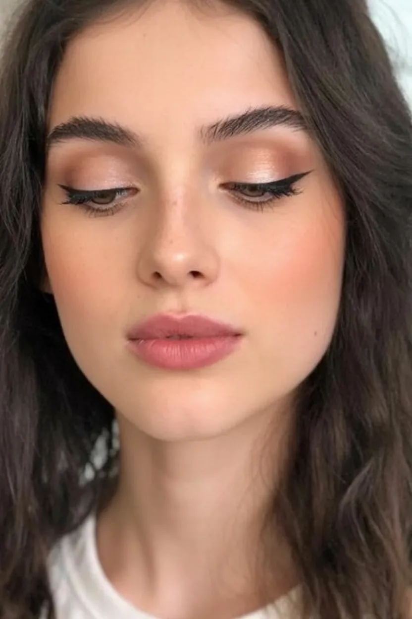 If you’re looking for motivation to finally get comfortable with eyeliner, let this be your sign. Brown eyes look especially striking with this combo because the liner deepens the lash line while the soft taupe shadow keeps everything open and balanced. Start with a pencil if liquid feels intimidating, then trace over it once you’ve got the shape right. Add mascara, brushed brows, and a mauve-nude lip, and you’re done. This would be so pretty for a Black dress moment, a dinner out, or even for prom if you want something classic instead of glitter-heavy glam. It’s polished, flattering, and absolutely worth practicing.