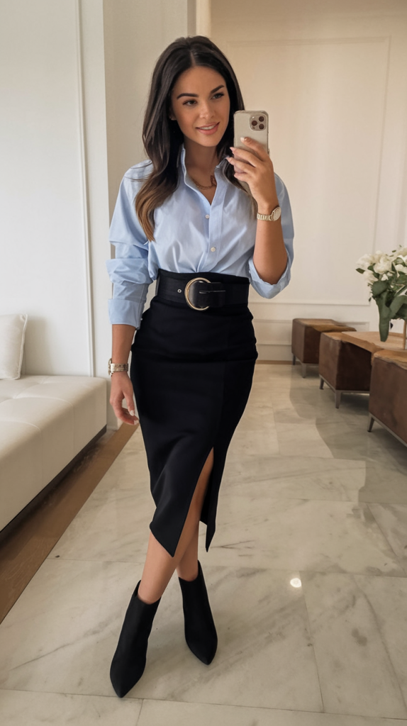 For those who love a polished and aesthetic look, a long black pencil skirt paired with a tucked-in light blue button-down shirt is a must-have combination. The structured black belt with a gold buckle adds definition to the waist, making this outfit perfect for the office or a business lunch.