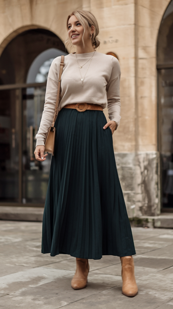A long pleated skirt in deep green is a classic wardrobe essential, ideal for fall and winter. Paired with a cream sweater and a tan belt, this outfit is warm, stylish, and comfortable. Tan ankle boots and a neutral crossbody bag complement the cozy aesthetic. Perfect for a casual outing, work, or weekend brunch.