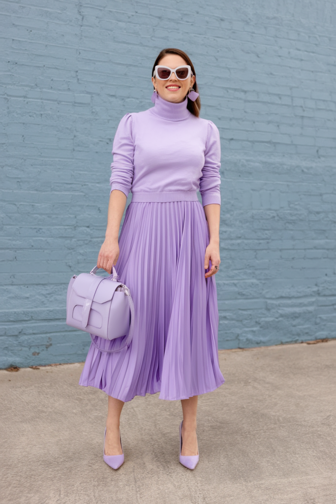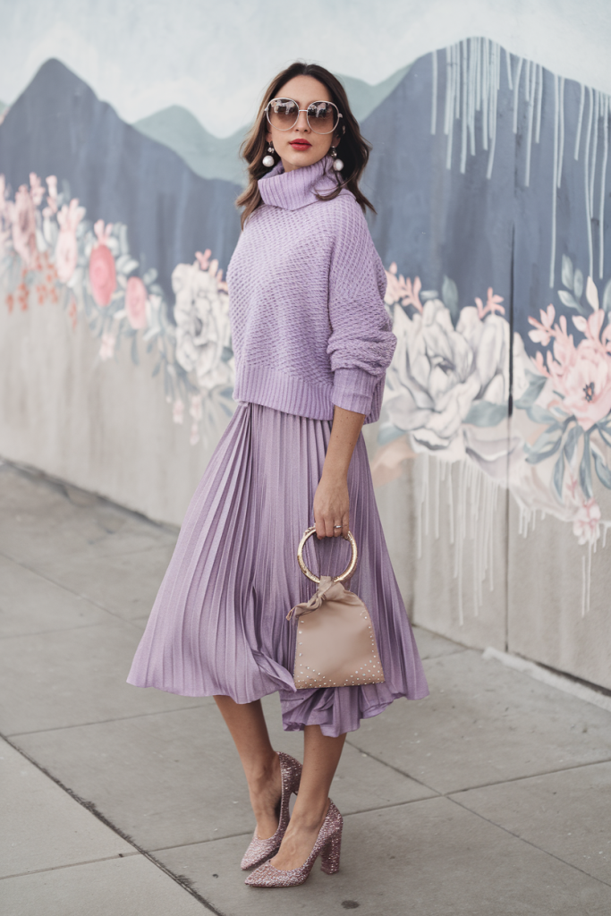 Monochrome dressing remains a top trend in 2025, and this lavender pleated maxi skirt paired with a matching lavender turtleneck sweater is nothing short of perfection. The coordinated handbag and heels enhance the sophisticated yet playful aesthetic.