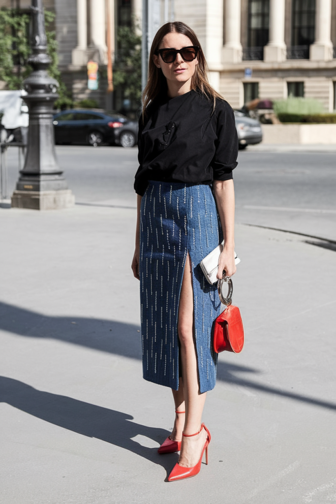 A long denim skirt with a high slit is an essential for modern street style. Paired with a black blouse, red heels, and a statement handbag, this look is sophisticated yet edgy. Ideal for fall and spring, this outfit is bold, confident, and perfect for city life.