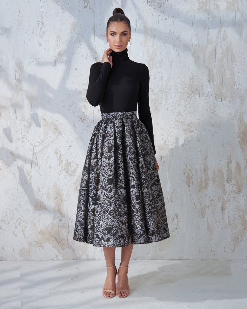 This high-waisted black and white brocade midi skirt pairs beautifully with a fitted black turtleneck, making it a striking choice for formal winter events. Styled with minimalist heels and gold accessories, this outfit is a testament to timeless elegance.